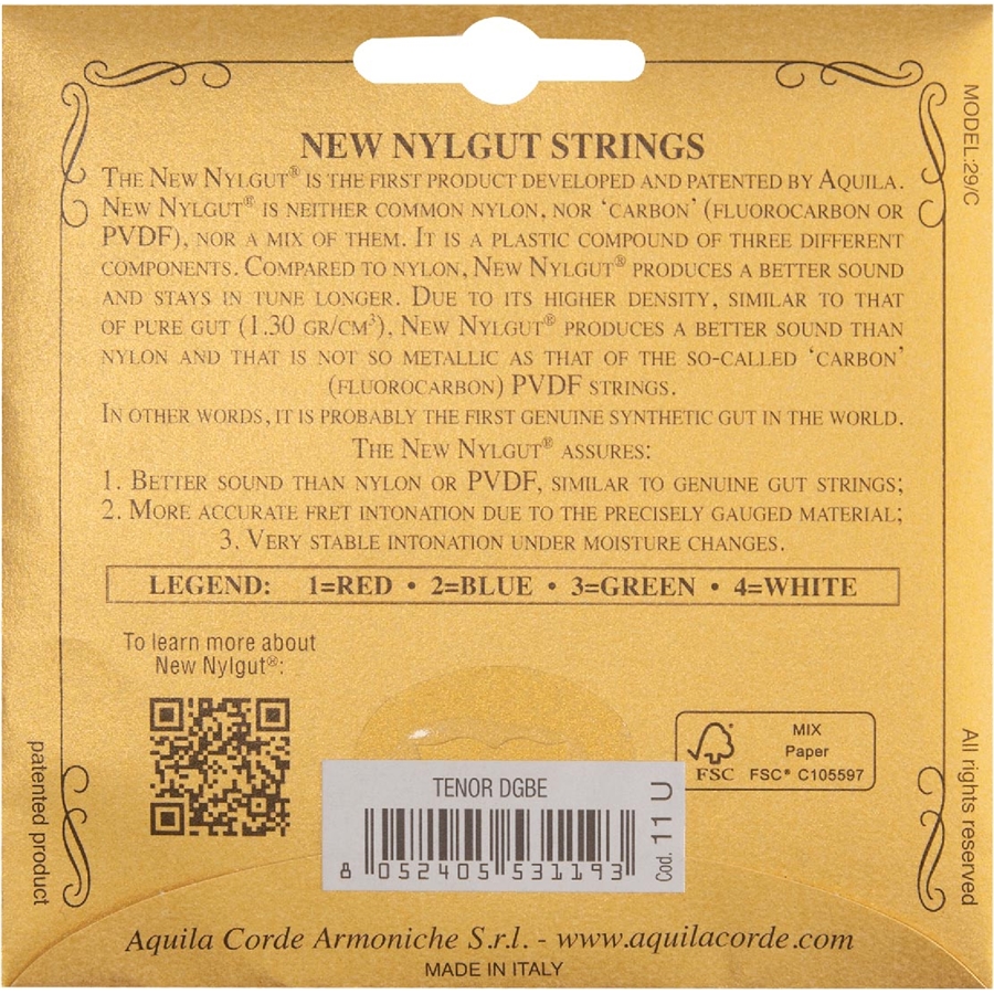 <h1 style="text-align: justify;">11U &egrave; il set di corde per ukulele tenore high-D con corda 1 Red Series, della serie New Nylgut di Aquila Corde Armoniche. Sono realizzate in materiale sintetico che riproduce la sensazione e il timbro del vero budello.</h1><h2>Guarda il video delle corde per ukulele New Nylgut di Aquila Corde Armoniche</h2><center><iframe title="New Nylgut Set _ Ukulele Strings _ Aquila Corde Armoniche" src="https://www.youtube.com/embed/mbjUzFce9nY?list=PLu-b8VtUnNsVTHRwbQZPBW9JoxXiG3Hi0" width="1236" height="695" frameborder="0" allowfullscreen="allowfullscreen"></iframe></center><p>&nbsp;</p><h2>Panoramica della serie New Nylgut di Aquila Corde Armoniche</h2><p style="text-align: justify;">I set per Ukulele sono realizzati utilizzando materiali innovativi, scoperti e perfezionati nei laboratori Aquila dopo un lungo periodo di ricerca e dopo essere stati minuziosamente testati, dando luogo cos&igrave; a un nuovo prodotto sintetico di alta tecnologia. Analogamente al budello, il New Nylgut&reg; &egrave; un materiale sensibile al taglio. Prima di montare le corde assicurarsi che i solchi al capotasto e al ponticello siano poco profondi, perfettamente levigati e privi di angoli taglienti. In caso contrario utilizzare della tela smeriglio di grana 600 o della lana d&rsquo;acciaio a grana fine. Per raggiungere entro pochi minuti una perfetta stabilit&agrave; di intonazione si consiglia di tirare lateralmente, e con forza, ogni singola corda durante la fase di accordatura. Sospendere l&rsquo;operazione soltanto quando la corda non cala ulteriormente di frequenza.</p>