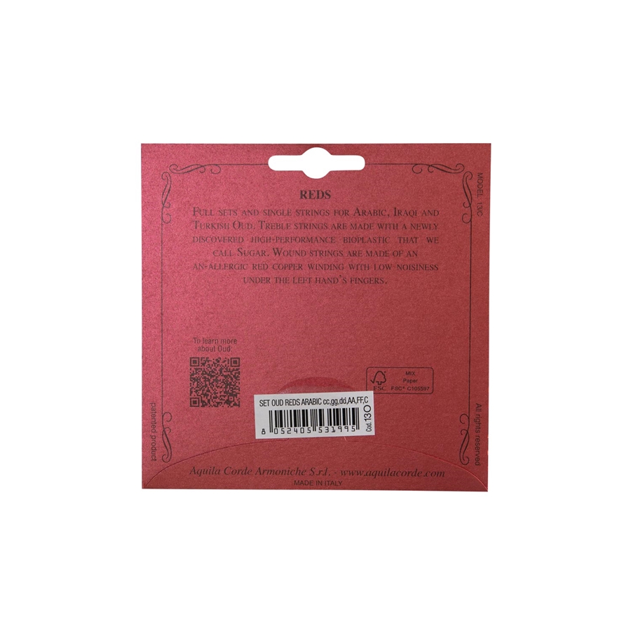 <h1 style="text-align: justify;">13O Reds Oud Arabic è il set di corde per oud arabic a 11 corde di Aquila Corde Armoniche, con scalatura 0,56-1,25. È caratterizzato da un suono metallico.</h1><h2>Panoramica delle 13O Reds Oud Arabic di Aquila Corde Armoniche</h2><p style="text-align: justify;">I set hanno una tensione di lavoro di 3,4 Kg per corda. I cantini sono realizzati con una bio-plastica di recente scoperta e ad alte prestazioni acustiche, derivata dalla canna da zucchero, e da Aquila denominata “Sugar“. Le corde rivestite sono realizzate in rame rosso anallergico (ad eccezione delle terze, per i set Oud Arabo e Turco, e delle quarte per il set Oud Iracheno, che sono in una lega metallica di color grigio) e a bassa rumorosità sotto le dita.</p><h3>Il problema delle corde di Re del set per Oud Arabo e Iracheno, e dei Mi del set per Oud Turco</h3><p style="text-align: justify;">Le terze corde dei set per Oud Arabo (Re) e Turco (Mi), così come le quarte corde del set Oud Iracheno (Re), sono normalmente costituite da corde rivestite che da sempre risultano difficili da realizzare utilizzando i comuni materiali a disposizione (rame argentato o rame verniciato). Per ottenere il giusto tono con le giuste tensioni, si dovevano utilizzare fili di rivestimento talmente fini che portavano ad una rapida usura della corda, rendendola più fragile rispetto al resto del set. Grazie ad una costante ricerca sui materiali, Aquila Corde propone due soluzioni innovative, garantendo allo stesso tempo un’ottima resa acustica, grande stabilità e resistenza, e un buon bilanciamento col resto del set:</p><ul><li style="text-align: justify;">La prima soluzione, che viene <u>proposta di default</u> su tutti i set, è una <strong>corda rivestita</strong> di color <strong>grigio</strong> prodotta con un filo metallico altamente resistente e performante, del tutto anallergico, in grado di soddisfare tutti coloro che sono abituati a suonare una corda filata in quella posizione;</li><li style="text-align: justify;">La seconda soluzione prevede una <strong>corda sintetica</strong> di color <strong>bruno rossastro</strong>, realizzata con una speciale bio-plastica caricata con polvere di metallo al fine di aumentarne la densità. La corda sintetica presenta una superficie perfettamente liscia, e le prestazioni sono di gran lunga migliori rispetto alle tradizionali corde filate.</li></ul><h2>Specifiche delle 13O Reds Oud Arabic di Aquila Corde Armoniche</h2><p><strong>Diametri</strong>: C 1,25w - FF 0,84w - AA 0,73w - dd 0,63w - gg 0,74 - cc 0,56</p>