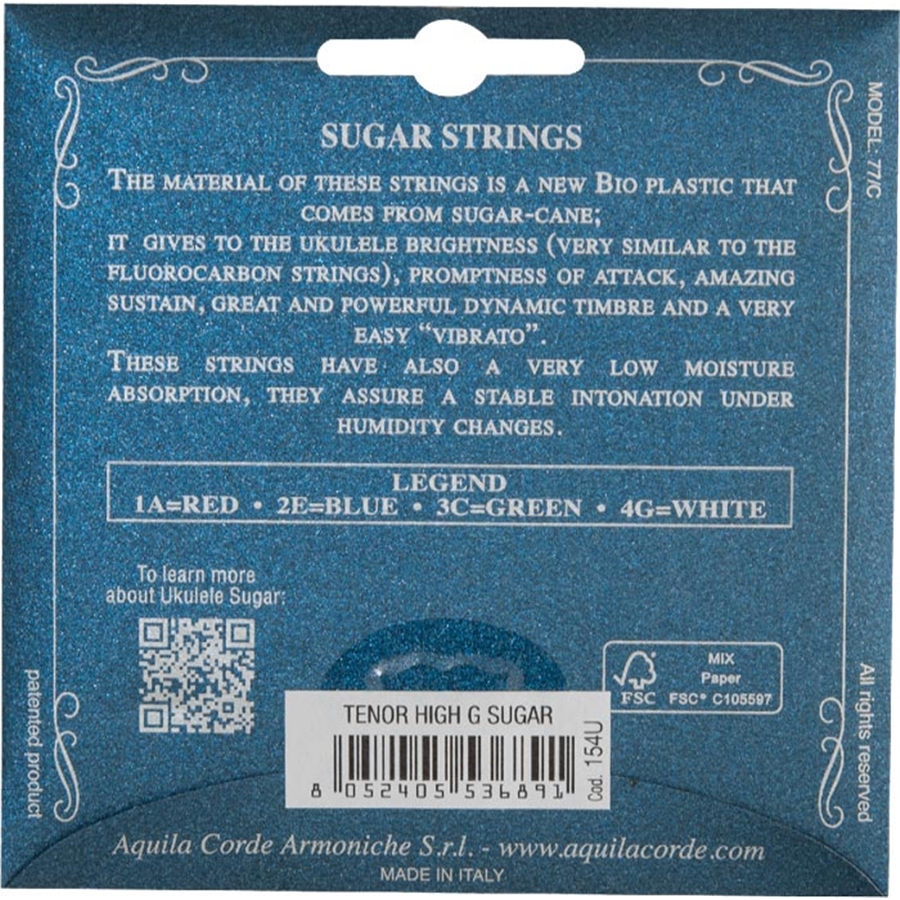 <h1 style="text-align: justify;">154U è il set di corde per ukulele tenore high-G della serie Sugar di Aquila Corde Armoniche. Sono realizzate utilizzando una bio-plastica di recente scoperta italiana derivata dalla canna da zucchero, regalando un timbro brillante e un grande sustain.</h1><h2>Guarda il video delle corde per ukulele Sugar di Aquila Corde Armoniche</h2><center><iframe title="Sugar Set _ Ukulele Strings _ Aquila Corde Armoniche" src="https://www.youtube.com/embed/pIRLdhsOpR8?list=PLu-b8VtUnNsVTHRwbQZPBW9JoxXiG3Hi0" width="1236" height="695" frameborder="0" allowfullscreen="allowfullscreen"></iframe></center><p> </p><h2>Panoramica della serie Sugar di Aquila Corde Armoniche</h2><p style="text-align: justify;">Le corde Sugar per Ukulele sono realizzate utilizzando una bio-plastica di recente scoperta italiana derivata dalla canna da zucchero. La sonorità di queste corde risulta essere decisamente brillante, pulita e netta al tocco. A differenza delle corde in Fluorocarbonio, le corde possiedono un eccellente vibrato ed una notevole variazione timbrica, qualora suonate nei pressi del ponticello e poi verso la buca. In altre parole esse contengono nel loro estremo la dolcezza e cantabilità del budello e la chiarezza e prontezza tipiche del Fluorocarbonio. Un’altra importante proprietà è il caratteristico sustain, che da misurazioni scientifiche è risultato superiore ad ogni tipologia di corda attualmente disponibile nel mercato. Un’altra caratteristica misurata è la potenza di emissione: i test scientifici hanno dimostrato che essa è superiore a quella delle corde in Fluorocarbonio. Nonostante la superficie sia estremamente liscia, il grip sulle dita risulta notevole.</p><h2>Specifiche delle 154U Sugar di Aquila Corde Armoniche</h2><p><strong>Diametri</strong>: G 0,70 - C 0,97 - E 0,82 - A 0,65</p>