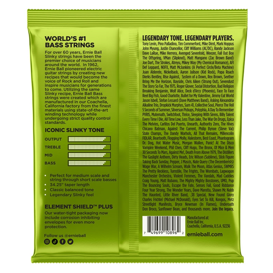 <p class="lead"><strong>EB 2856 Regular Slinky Nickel Wound Medium Scale</strong> è la muta di corde per basso elettrico di casa <strong>Ernie Ball</strong>, con scalatura <strong>45/105</strong>. Sono progettate per bassi a scala media/corta e quindi perfette per i bassisti che amano suonare con strumenti in scala ridotta senza perdere il feeling e il timbro di quelli a scala lunga.</p><h3>PANORAMICA</h3><p>Le corde per basso Ernie Ball Medium Scale Slinky sono costruite utilizzando gli stessi metodi e materiali di produzione delle famose corde per basso Slinky avvolte in nichel. Offrendo la stessa sensazione slinky e il tono brillante e bilanciato, queste nuove corde sono specificamente progettate per adattarsi a bassi con scala fino a 32,5" e bassi a scala corta che montano ponti stile Fender Mustang vintage.</p><h3>CARATTERISTICHE</h3><br><ul style="margin-left: 17px;"><li>Lunghezza 34,25" (distanza dal ball end all'estremità opposta)</li><li>Avvolto con acciaio nichelato</li><li>Nuclei esagonali in acciaio stagnato</li><li>Imballaggio Element Shield</li><li>Realizzato nel sud della California, USA</li><li>Scalatura 45/105</li></ul>