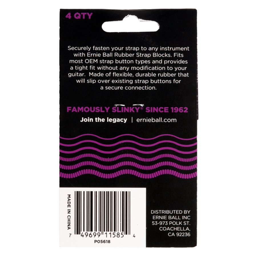 <h1 style="text-align: justify;">Il 5618 &egrave; il blocco in gomma color viola di casa Ernie Ball progettato per fissare saldamente la tracolla ai pin del tuo strumento, chitarra o basso. Realizzato in gomma siliconica flessibile, si adatta a qualsiasi bottone per cinghia e pu&ograve; essere montato con estrema facilit&agrave; e velocit&agrave;.</h1><h2>PANORAMICA DELLO STRAP BLOCK 5618 DI ERNIE BALL</h2><p style="text-align: justify;">Fissate in modo sicuro la vostra tracolla a qualsiasi strumento con i blocchi per tracolla Ernie Ball. Si adatta alla maggior parte dei tipi di bottoni e garantisce un&#39;aderenza perfetta senza alcuna modifica alla chitarra. Realizzati in gomma flessibile e resistente, scivolano sui bottoni della cinghia esistenti per un collegamento sicuro. Disponibile in otto nuovi colori: Viola, blu, rosso, arancione, verde, rosa, crema e grigio.</p><h2>PUNTI DI FORZA DELLO STRAP BLOCK 5618 DI ERNIE BALL</h2><ul>    <li>Disponibile in 8 nuovi colori</li>    <li>Facile da installare</li>    <li>Realizzato in resistente gomma siliconica</li>    <li>Si adatta alla maggior parte dei bottoni delle tracolle</li>    <li>Quantit&agrave; 4 per confezione</li></ul>