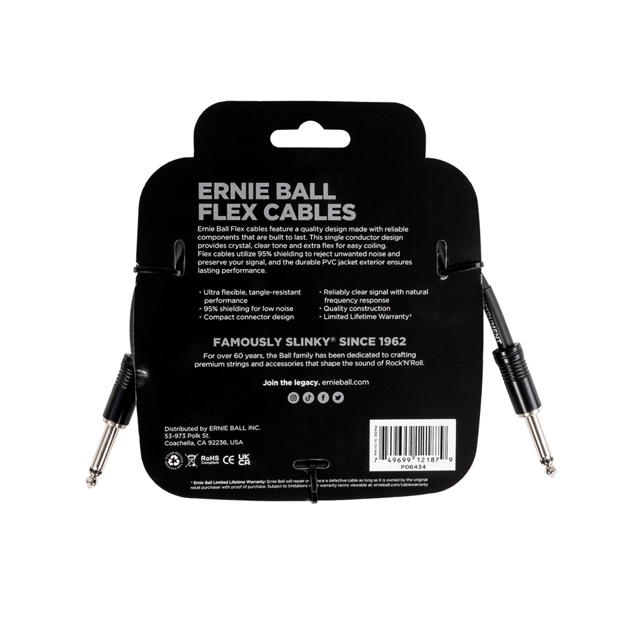 The 6434 is a 3-meter instrument cable from Ernie Ball's "Flex" series in black with straight plugs on both ends. Its single conductor makes it exceptionally flexible, and the 95% shielding ensures a crystal-clear sound. ERNIE BALL 6434 FLEX CABLE OVERVIEW: Ernie Ball Flex cables feature a quality design and reliable components designed to last. The single-conductor design offers a clear, crisp tone and increased flexibility for easy winding. Flex cables use 95% shielding to reject unwanted noise and preserve the signal, and the PVC outer jacket ensures long-lasting performance. ERNIE BALL FLEX 6434 CABLE HIGHLIGHTS