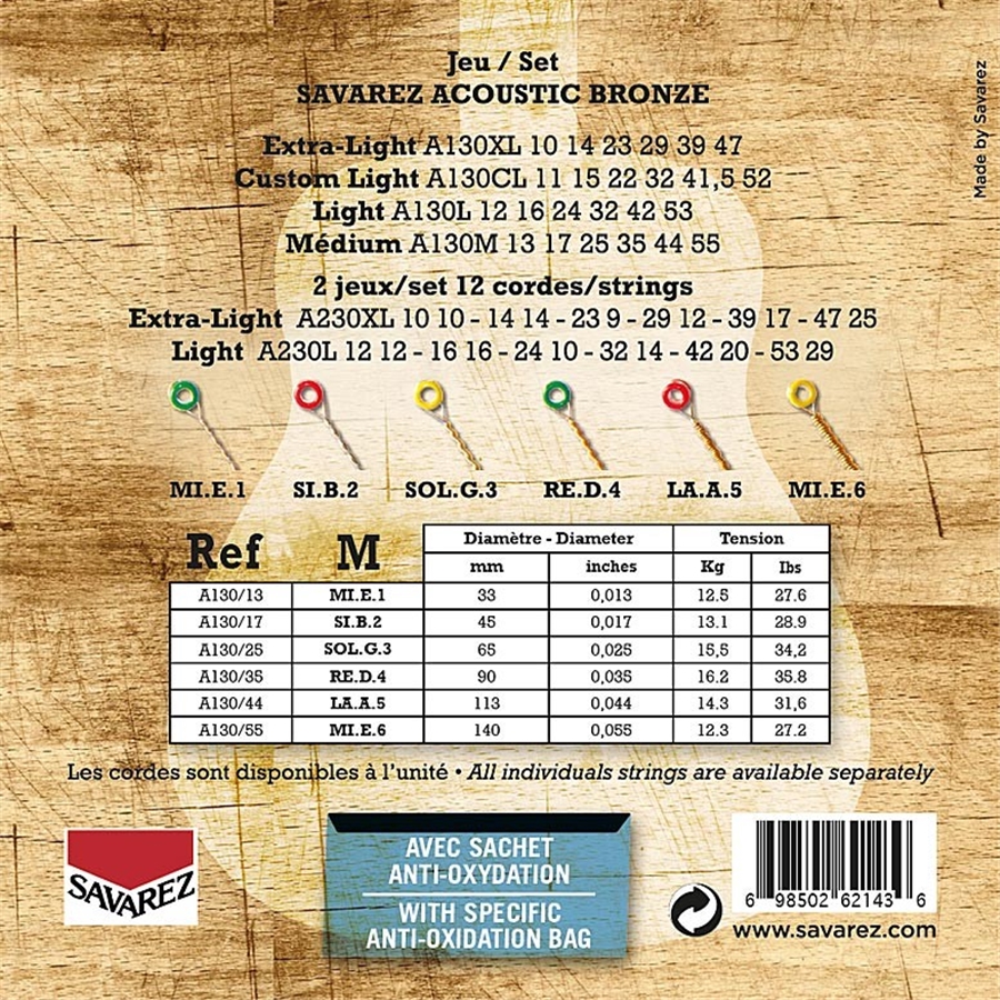 <h1 style="text-align: justify;"><strong>A130M Medium</strong> &egrave; il set di corde per <strong>chitarra acustica 13-55</strong> della serie <strong>Acoustic Bronze</strong> di <strong>Savarez</strong>. Queste corde sono realizzate con nuovi materiali di elevata qualit&agrave;, combinati in maniera specifica per massimizzare le caratteristiche sonore e di suonabilit&agrave;.</h1><h2>PANORAMICA</h2><p style="text-align: justify;">Oltre 70 anni di produzione delle serie <strong>Acoustic Bronze</strong> e <strong>Phosphor Bronze</strong> hanno permesso a <strong>Savarez</strong> di introdurre importanti miglioramenti. Le nuove macchine e i processi produttivi estremamente precisi fanno s&igrave; che le corde della serie Acoustic Bronze abbiano una qualit&agrave; costante. La qualit&agrave; sonora, la proiezione e il volume, la dinamica e l&#39;equilibrio sono caratteristiche che hanno reso queste corde famose tra i chitarristi acustici.</p><h2>SET</h2><p><strong>A130/13:</strong> MI-E-1, 0.013<br /><strong>A130/17:</strong> SI-B-2, 0.017<br /><strong>A130/25:</strong> SOL-G-3, 0.025<br /><strong>A130/35:</strong> RE-D-4, 0.035<br /><strong>A130/44:</strong> LA-A-5, 0.044<br /><strong>A130/55:</strong> MI-E-6, 0.055</p>