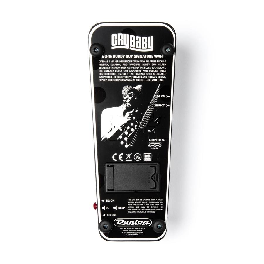 <h1 style="text-align: justify;">Il <strong>BG95 Budd Guy Cry Baby® Wah</strong> è il <strong>pedale wah</strong> di <strong>Jim Dunlop</strong> signature di <strong>Buddy Guy</strong>, dotato del leggendario <strong>Fasel® Inductor</strong> e di due voci distinte: la <strong>"Deep"</strong> fornisce un suono grosso e profondo, la <strong>"BG"</strong> il classico suono "a campana" di Buddy.</h1><h2>PANORAMICA</h2><p style="text-align: justify;">Citato come influenza da grandi chitarristi e utilizzatori di wah come Hendrix, Clapton e Vaughn, <strong>Buddy Guy</strong> ha contribuito a far entrare questo effetto nel vocabolario blues. Per onorare il suo contributo, <strong>Dunlop</strong> ha creato il <strong>Buddy Guy Cry Baby Wah</strong>, dotato del leggendario <strong>Fasel® Inductor</strong> e due voci distinte: seleziona la voce <strong>"DEEP"</strong> per un suono pieno e profondo, e seleziona <strong>"BG"</strong> per ottenere il classico suono di Buddy. Dei LED laterali indicano quale modalità è attiva, mentre un LED separato indica se il pedale è acceso o spento. Suona il tuo blues con stile, grazie alla grafica <strong>"polka dot"</strong> approvata da Buddy.</h1><h2>ALIMENTAZIONE</h2><p style="text-align: justify;">Questo pedale può essere alimentato con due batterie da 9-volt o con un adattatore AC, come il Dunlop ECB003, l'Iso-Brick o il Mini Iso-Brick (non inclusi).</p><h2>CONTROLLI</h2><p><strong>Switch laterale:</strong> seleziona la modalità "DEEP" o "BG".<br></p><h2>PUNTI DI FORZA</h2><ul style="margin-left: 17px;"><li>Modalità DEEP per un suono grosso e profondo;</li><li>Modalità BG per il tipico suono "a campana" di Buddy Guy;</li><li>LED di stato che indicano lo stato del pedale e la modalità attiva.</li></ul><h2>SPECIFICHE TECNICHE DEL BG955 BUDDY GUY CRY BABY WAH</h2><p><strong>Impedenza in ingresso:</strong> 1 MOhm<br><strong>Impedenza in uscita:</strong> <4.7 kOhm<br><strong>Livello massimo di ingresso:</strong> -6 dBm<br><strong>Livello massimo di uscita:</strong> 7 dBm<br><strong>Gain massimo tallone verso il basso:</strong> 16 dB<br><strong>Gain massimo punta verso il basso:</strong> 16 dB<br><strong>Rapporto segnale-rumore tallone verso il basso:</strong> >96 dBV<br><strong>Rapporto segnale-rumore punta verso il basso:</strong> >95 dBV<br><strong>Range di frequenze modalità "BG":</strong> 290 Hz - 1900 Hz<br><strong>Range di frequenze modalità "DEEP":</strong> 250 Hz - 1600 Hz<br><strong>Bypass:</strong> True Hardwire Bypass<br><strong>Assorbimento di corrente:</strong> <3.5 mA<br><strong>Alimentazione:</strong> 9 volt DC<br></p>