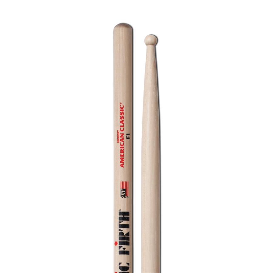 <h1>La bacchetta per batteria Vic Firth F1 American Classic &egrave; una bacchetta con punta rotonda con collo corto e affusolato che aiuta ad accentuare i suoni dei piatti, ideale per la musica in cui i piatti devono uscire in maniera più decisiva. Ottima per la fusion o il jazz.</h1><h2>Specifiche:</h2><h3>Diametro: .580"" | 1,47 cm<br />Lunghezza: 16,188&rdquo; | 41,12 cm<br />Famiglia: American Classic<br />Tipo di legno: Hickory<br />Cono: Corto<br />Finitura: Laccata<br />Materiale punta: Legno<br />Forma punta: Rotonda</h3>