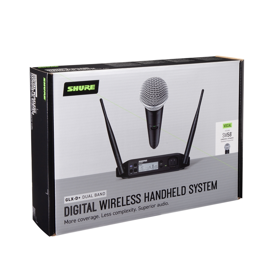 <p style="text-align: justify;">Caratterizzato dal microfono a gelato <strong>Shure SM58</strong>, uno standard dell&#39;industria, il sistema vocale <strong>GLXD24+/SM58</strong> a doppia banda (2.4GHz e 5.8GHz) offre un audio digitale superiore e trasparente. La perfetta combinazione della gestione automatica delle frequenze con la nuova tecnologia a doppia banda (2.4GHz e 5.8GHz) garantisce prestazioni affidabili, mentre le batterie ricaricabili al litio proprietarie di Shure offrono fino a 12 ore di utilizzo. Il sistema include il trasmettitore palmare <strong>GLXD2+/SM58 </strong>e il ricevitore da tavolo <strong>GLXD4+</strong>.</p>