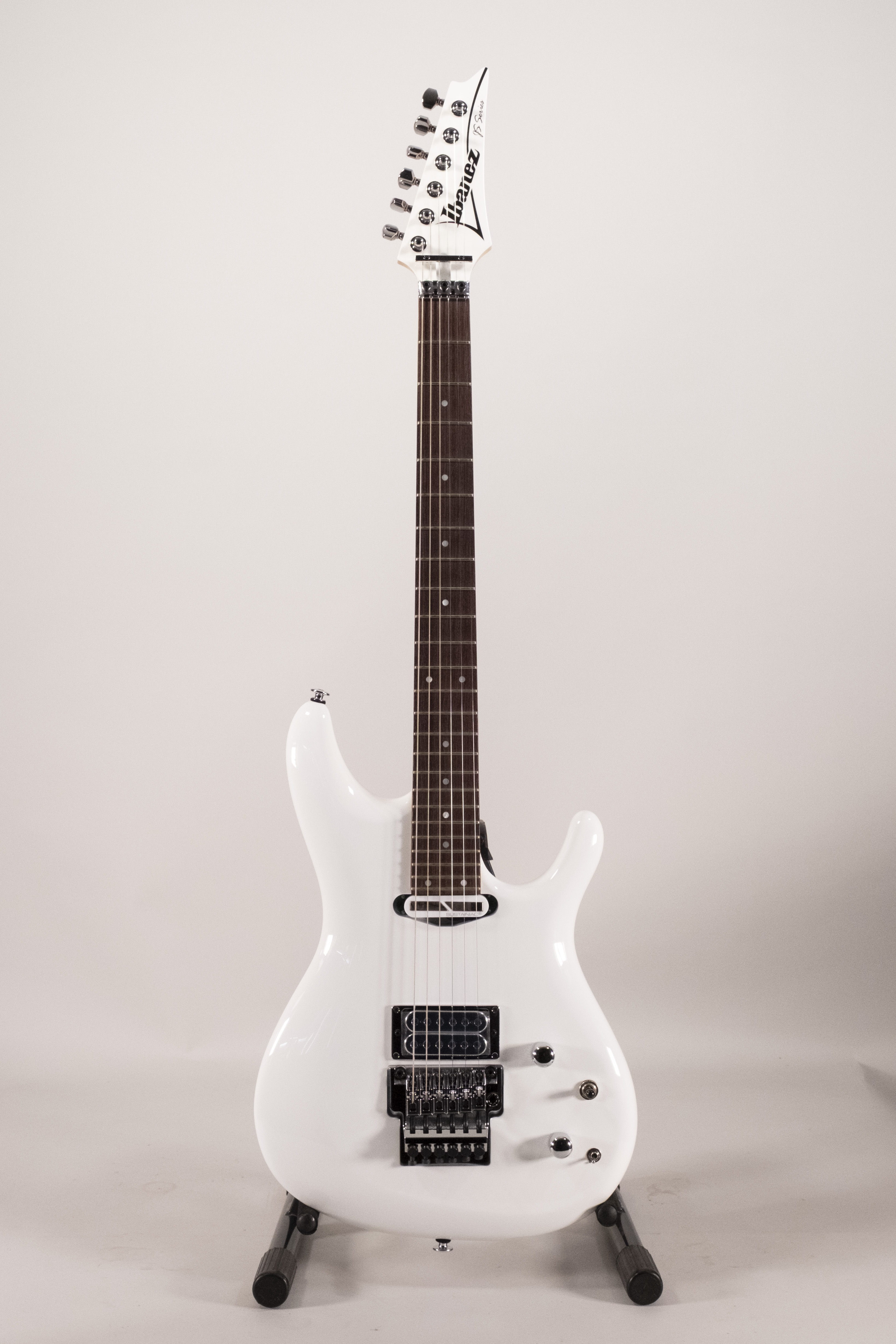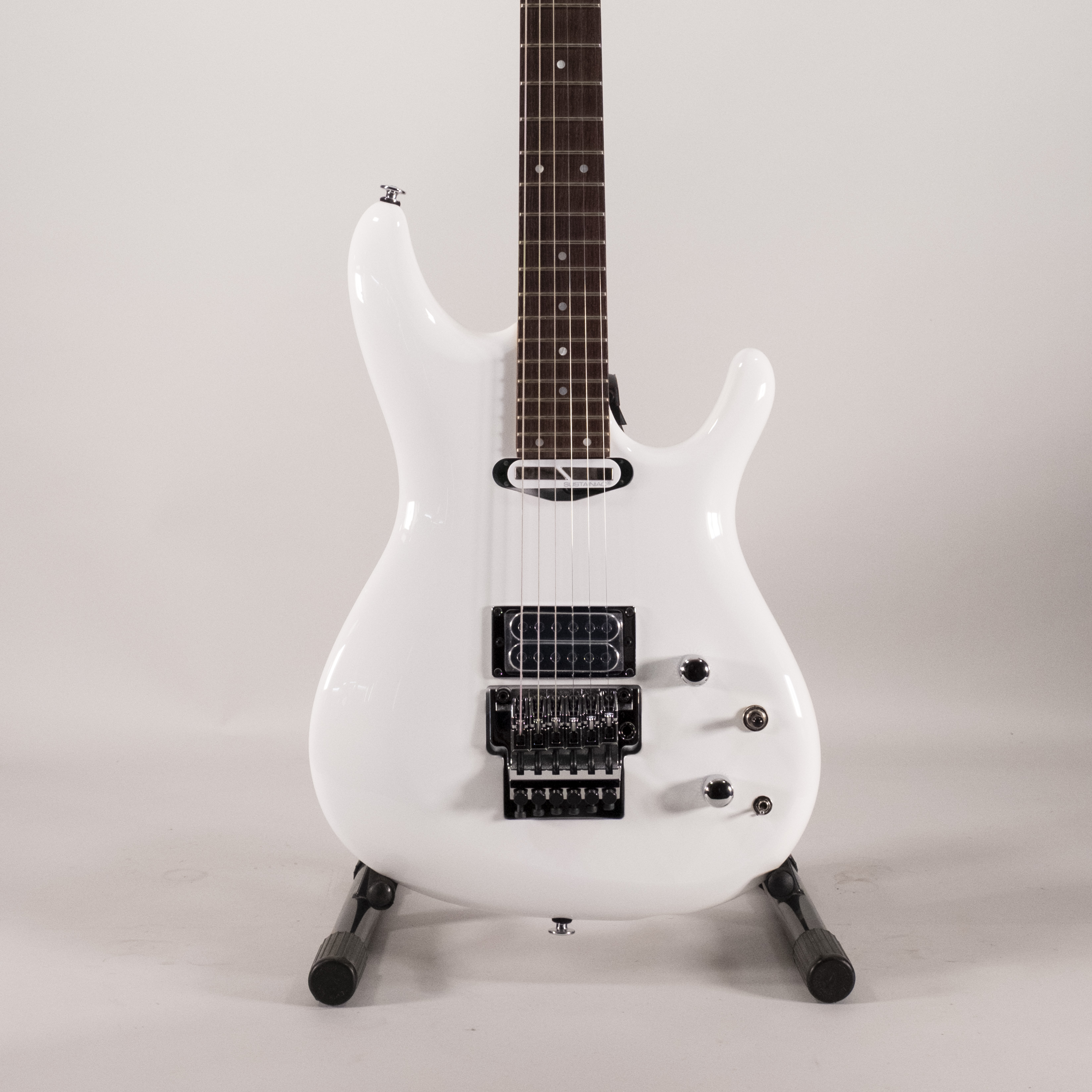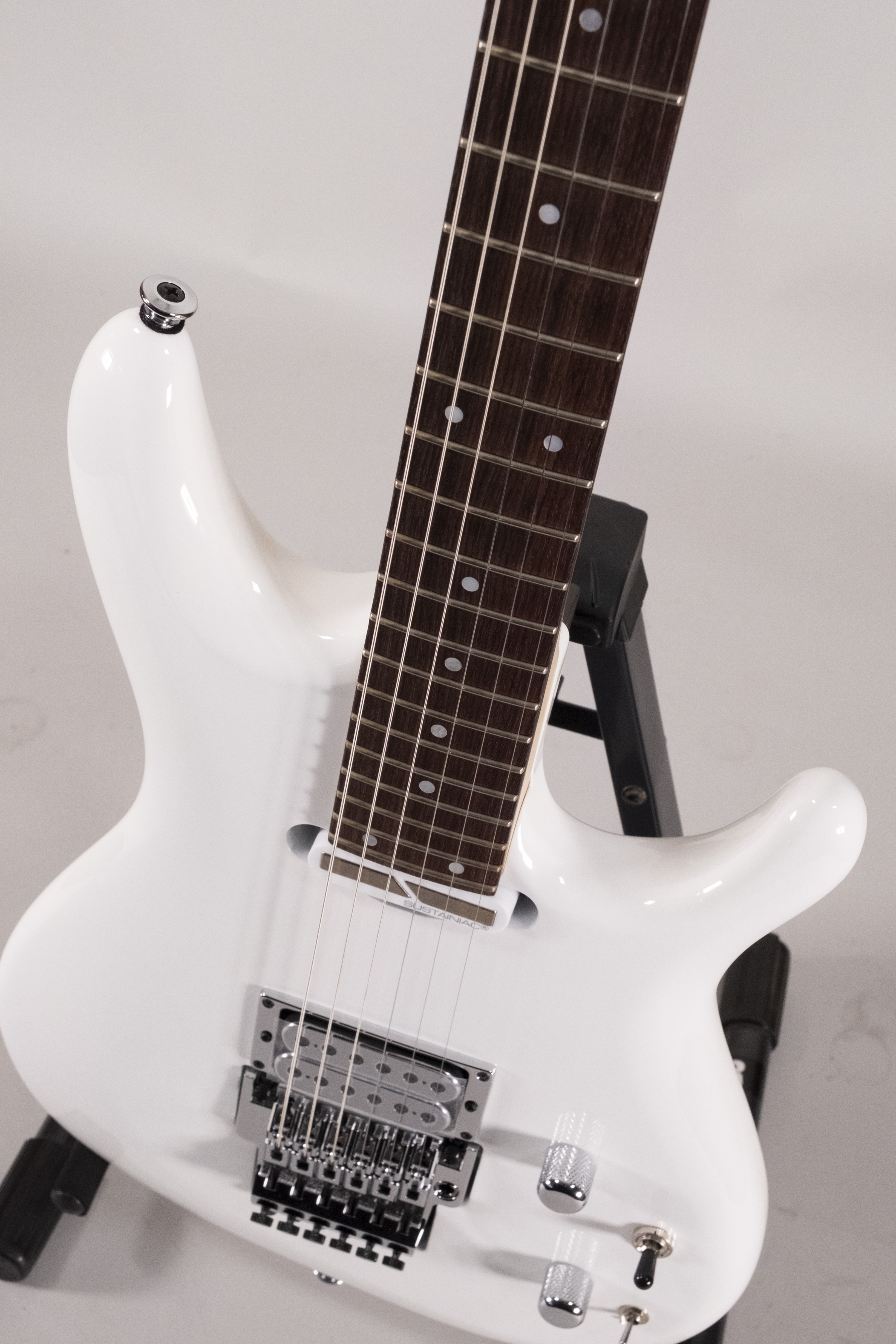 The JS2480-WH from Ibanez isn't designed to win you over by accident: it's all about performance. Its basswood body and rosewood fingerboard offer a clear tonal balance, with a responsive midrange. The guitar's character is straightforward, no-nonsense and formidably effective. This guitar is just waiting to be played by curious fingers and an amp with the right attitude. As for the neck, it's all too easy. The asymmetrical JS profile hugs the hand without rushing it, and the medium frets, combined with the Prestige treatment, let you glide to the end of the 24 fret range with disconcerting fluidity. Even the bends hesitate to come back down once you've reached the top. The humbucker duo wasn't chosen by tossing a coin. The Sustainiac in the neck, which can be activated via a push/pull and a 3-position mini-switch, gives access to a controllable, almost infinite sustain, which is great for held notes, spectral strings or solos that refuse to stop. At the other end of the scale, the DiMarzio Satchur8 is a real beast: edgy, sharp, and always ready to roar without screaming.