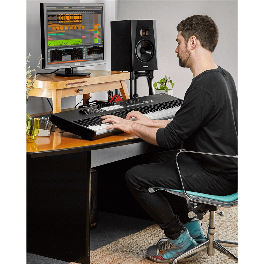<h1 style="text-align: justify;"><strong>Novation LAUNCHKEY 88 MKIII</strong> è una Master Keyboard e controller MIDI USB per Ableton Live equipaggiata di una tastiera 88 tasti semi pesati di alta qualità e 16 pad RGB sensibili alla velocity, 9 fader, 8 potenziometri rotativi, un arpeggiatore, modalità Chord e Scale, funzione Capture MIDI, Pitch e Mod wheel, e controlli di trasporto. Compatibilità HUI per integrazione e controllo remoto dei software DAW: Logic Pro, Cubase, Reason.</h1><h2 style="text-align: justify;"><strong>La tastiera di Launchkey 88</strong></h2><p style="text-align: justify;">I tasti danno maggior spazio all’espressività nelle esibizioni. Differisce dalle altre tastiere della serie Launchkey grazie al suo tocco reattivo e al feedback tattile ottimizzati. <strong>Novation Launchkey 88</strong> cattura ogni sfumatura della tua perfomance, grazie alla possibilità di configurare la curva di risposta dinamica (velocity) al tocco.</p><h2 style="text-align: justify;"><strong>Tanta libertà di espressione in poco spazio</strong></h2><p style="text-align: justify;">Otto diverse modalità Scale ti accompagneranno nella composizione adattando automaticamente le note suonate alla scala selezionata. Basterà selezionare la tonica (root note) e la scala preferita, quindi iniziare a suonare. Sul fronte dell’armonia, le tre modalità Chord trasformano tasti e pad in una superficie interattiva per la creazione di progressioni armoniche. Grazie all'arpeggiatore è possibile esplorare nuove melodie e trovare rapidamente idee creative, mentre la funzione mutate consente di reinventare i pattern in nuove forme.</p><h2 style="text-align: justify;"><strong>Modalità personalizzabili</strong></h2><p style="text-align: justify;">I <strong>Custom Modes</strong> semplificano l'interazione tra controller e software, conferendoti un controllo ancora più completo. Programmabili tramite lo strumento basato sul software di Novation Components, questi modi personalizzati ti consentono di configurare il comportamento della tua <strong>tastiera Novation Launchkey</strong>, gestendo le assegnazioni dei controlli, il routing MIDI, il colore dei pad e molte altre funzionalità.</p><h2 style="text-align: justify;"><strong>Le connessioni di Launchkey 88</strong></h2><p style="text-align: justify;">Launchkey 88 dispone di un'uscita MIDI DIN a cinque pin per la connessione e il controllo di altri dispositivi MIDI. Grazie all’elevato potenziale in modalità standalone, <strong>Launchkey</strong> diventerà il fulcro del tuo set live oltre che in studio, con o senza l'uso del computer.</p><h2 style="text-align: justify;"><strong>Integrazione con Ableton Live</strong></h2><p style="text-align: justify;">La piattaforma <strong>Launchkey</strong> ha mantenuto sempre la sua flessibilità e la revisione MkIII prosegue con questa filosofia. Pad più ampi e sensibili alla velocity consentono un maggiore controllo sulla dinamica, mentre i 9 fader e gli 8 potenziometri mettono il software letteralmente a portata di mano. L'integrazione con <strong>Ableton Live</strong> è ottima, con un pulsante dedicato per attivare la funzione Capture MIDI, oltre ai controlli di armatura della traccia, quantizzazione, click e loop utili per muoverti rapidamente all'interno della tua sessione.</p><h2 style="text-align: justify;"><strong>Compatibilità con le più famose DAW grazie a HUI</strong></h2><p style="text-align: justify;">Oltre a offrire interazione e controllo immediati, senza eccessive configurazioni con applicativi audio/MIDI come Studio One, Cubase e Pro Tools tramite <strong>HUI</strong>, <strong>Novation Launchkey</strong> è pienamente integrato anche in altri software DAW: da Logic Pro a Reason. </p><h2 style="text-align: justify;"><strong>Software Components </strong></h2><p style="text-align: justify;">Components è un hub di gestione dei prodotti Novation, puoi accedere a nuovi sound pack, gestire i contenuti sonori, personalizzare il tuo dispositivo e rimanere aggiornato con il firmware più recente.</p><h2 style="text-align: justify;"><strong>Vasta selezione di suoni</strong></h2><p style="text-align: justify;">Launchkey 88 è un controller a tastiera che ti accompagnerà nel tuo percorso musicale. Grazie a una serie di software, tra cui Ableton Live 10 Lite, Spitfire Audio LABS Expressive Strings, XLN Audio Addictive Keys, Klevgrand Roverb e DAW Cassette e AAS Session Bundle, Launchkey 88 ti offre un'incredibile varietà di suoni.</p><h2 style="text-align: justify;"><strong>Aggiornamento firmware 1.1</strong></h2><p style="text-align: justify;">L'aggiornamento del firmware v1.1 introduce la funzione Strum Mode. Puoi tenere premute le note e attivare la modalità Strum utilizzando la mod wheel del Launchkey. La modalità Strum può essere utilizzata insieme ad altre modalità dell'arpeggiatore per aumentare la creatività.</p><h2 style="text-align: justify;"><strong>Caratteristiche di NOVATION Launchkey 88 MkIII</strong></h2><ul> <li style="text-align: justify;">88 tasti semi-pesati sensibili alla velocity, con curva della velocity modulabile</li> <li style="text-align: justify;">Schermo 16x2 caratteri </li> <li style="text-align: justify;">Pitch e modulation wheel</li> <li style="text-align: justify;">9 Fader</li> <li style="text-align: justify;">8 potenziometri</li> <li style="text-align: justify;">16 pad tattili RGB sensibili alla velocity</li> <li style="text-align: justify;">Pulsante transpose</li> <li style="text-align: justify;">Pulsanti ottava up/down</li> <li style="text-align: justify;">Pulsanti play, record e loop</li> <li style="text-align: justify;">Pulsanti arp, Scale e Fixed chord</li> <li style="text-align: justify;">Pulsanti Capture MIDI, quantise, click e undo</li> <li style="text-align: justify;">Pulsanti stop, solo e mute</li> <li style="text-align: justify;">Pulsante di selezione tracce</li> <li style="text-align: justify;">Pulsante per lanciare scene</li> <li style="text-align: 