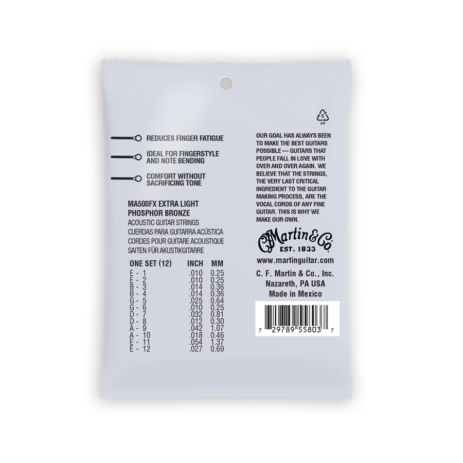 <h1 style="text-align: justify;">MA500FX &egrave; il set completo di corde per chitarra acustica 12 corde phosphore bronze della serie &quot;Authentic Acoustic Flexible Core&quot; di Martin &amp; Co. con scalatura .010-.054 e tensione extra-light. Sono caratterizzate dalla combinazione tra il filo interno Superior Performance alleggerito e un filo avvolgente pi&ugrave; pesante, regalando a questa muta un timbro caldo e allo stesso tempo una flessibilit&agrave; unica che favorisce un maggior comfort durante il playing.</h1><h2>Panoramica delle MA500FX Authentic Acoustic Flexible Core di Martin &amp; Co.</h2><p style="text-align: justify;">Le corde Martin&reg; Authentic Acoustic&reg; Flexible Core sono state progettate per ridurre l&#39;affaticamento delle dita e consentire grandi bending. Sono caratterizzate da una versione pi&ugrave; leggera del filo centrale Superior Performance, combinata con un filo avvolgente pi&ugrave; pesante per offrire un tono pieno e bilanciato con una maggiore flessibilit&agrave; e suonabilit&agrave;.</p><h2>Specifiche delle MA500FX Authentic Acoustic Flexible Core di Martin &amp; Co.</h2><p><strong>Diametri</strong>:&nbsp;.010/.010 - .014/.014 - .025/.010 - .032/.012 - .042/.018 - .054/.027</p>