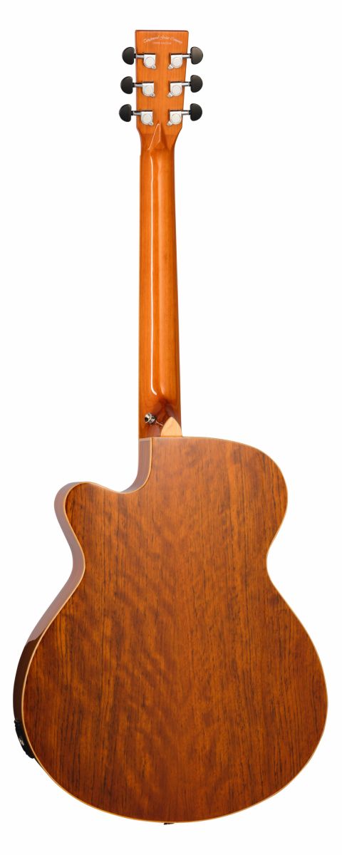 The guitar features a Spruce top, a wood renowned for its bright, vibrant sound and impressive projection. This gives the TRX4CE a crisp, clear tone that resonates beautifully, whether played softly or with more intensity. The Ovangkol back and sides further enhance the guitar’s overall tonal balance. Ovangkol, with its dense grain and rich, warm character, adds depth and warmth to the sound, creating a perfect complement to the bright and lively Spruce top. Together, these woods create a tonal profile that is both well-rounded and expressive, making it suitable for a wide range of musical styles.