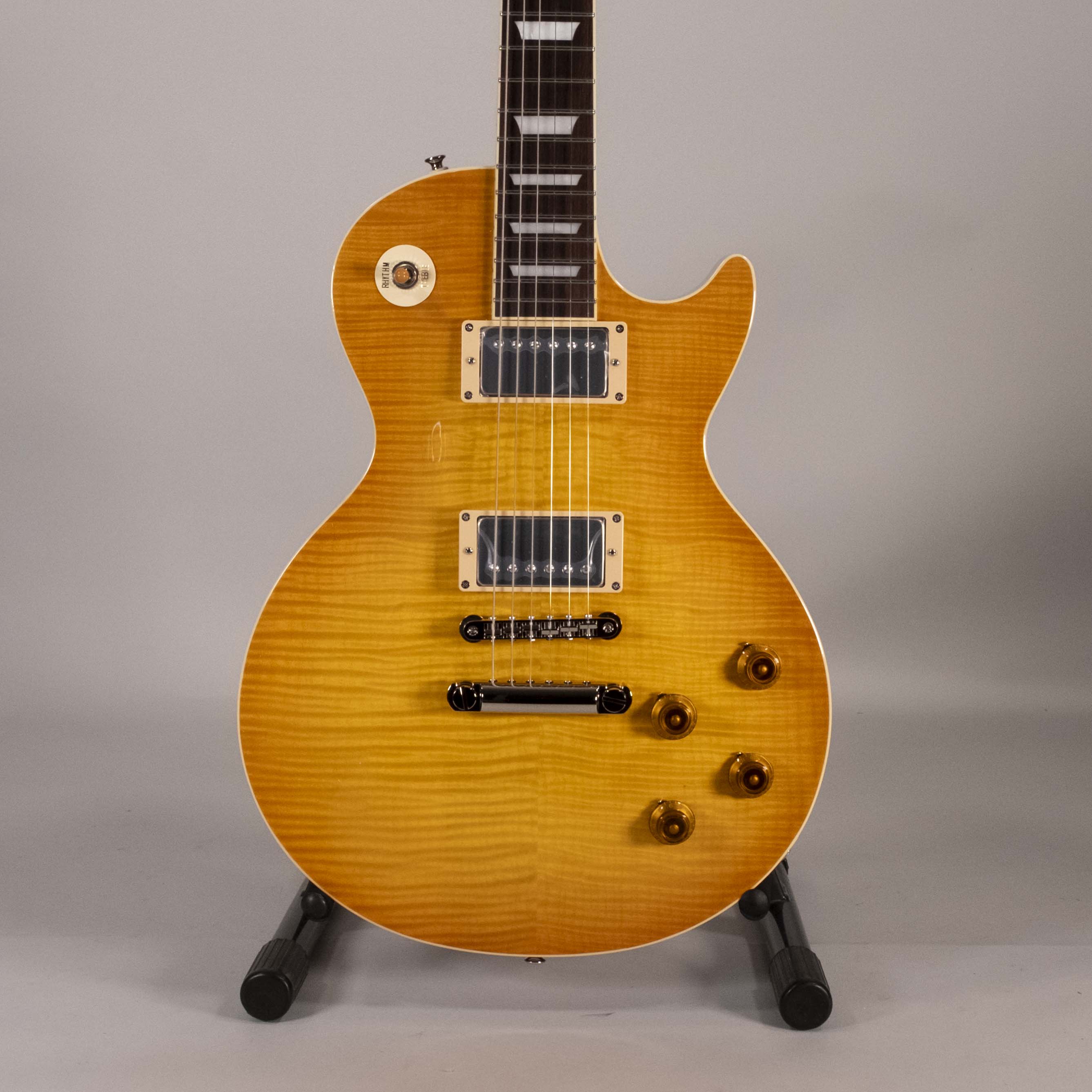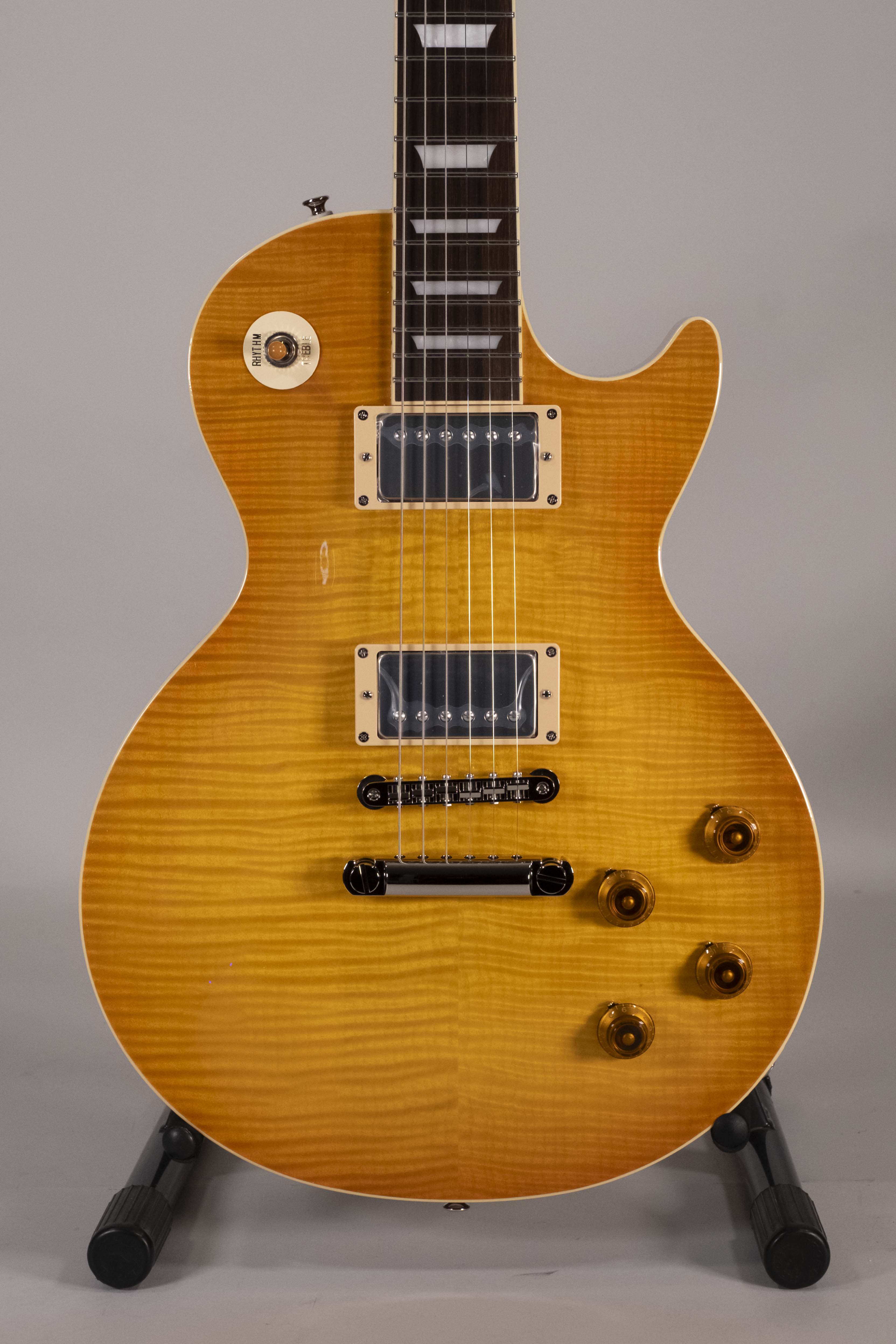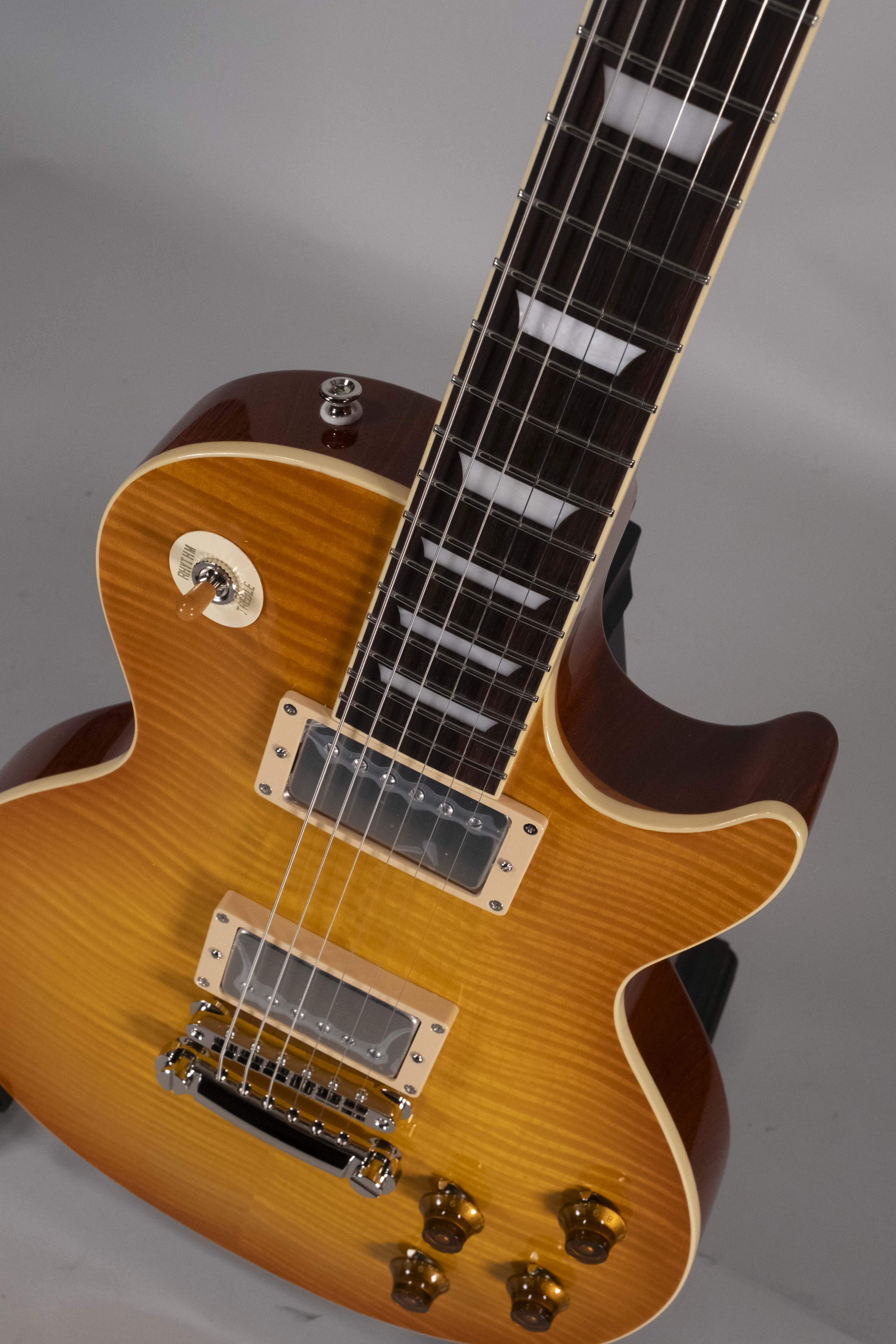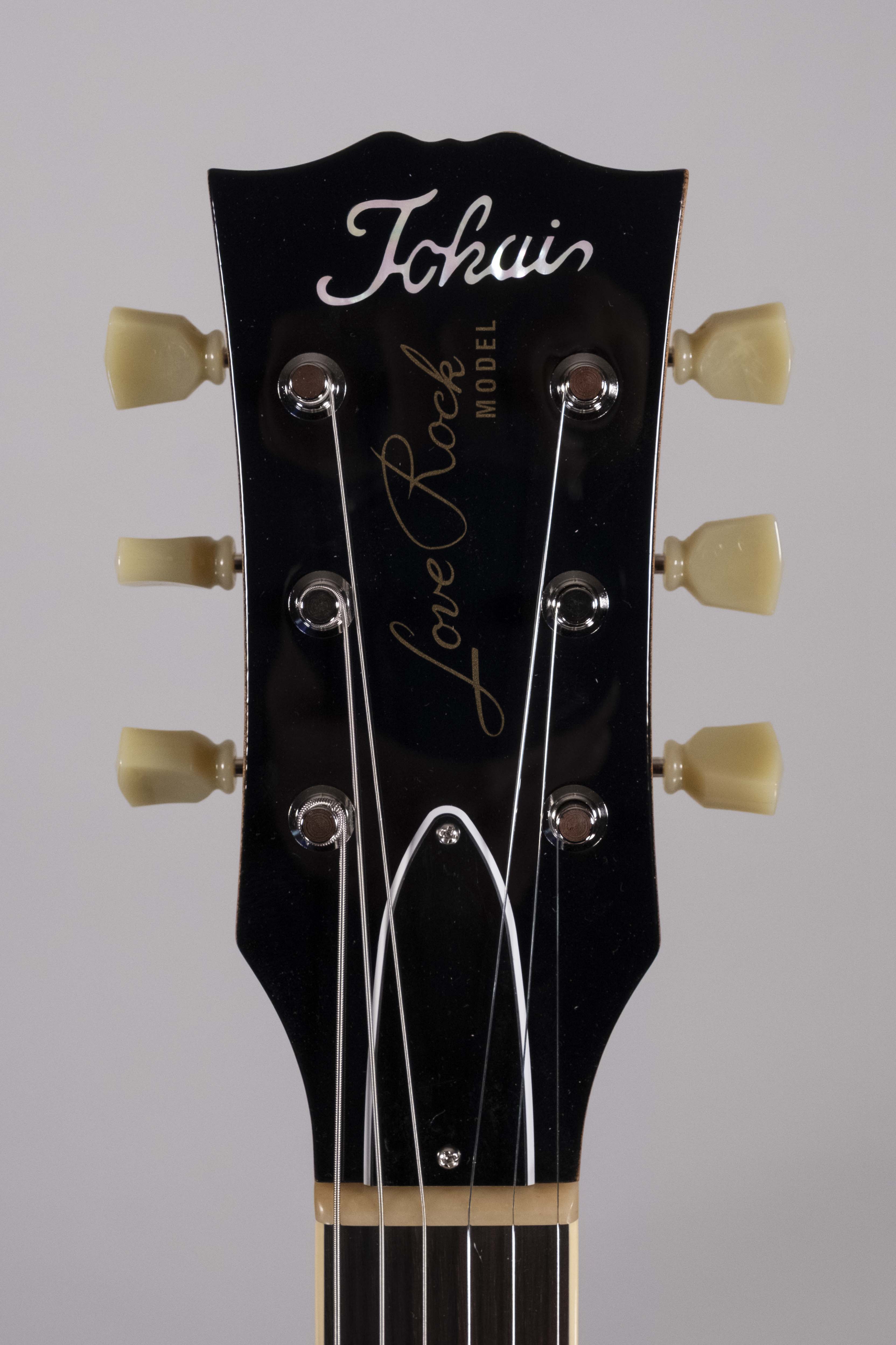 6 string electric guitar - Made in Japan - Structure: set-neck - Body: mahogany (two pieces) - Top: flamed maple (two pieces) arched - Neck: mahogany (one piece) asymmetrical U shape - Scale: 625.0mm - Fingerboard: rosewood - Radius R300 - 22 frets Sanko SBB-214 (Medium Jumbo) - Nut: 43mm bone - Inlays: trapezoid block - Pickguard: cream - Pickups: 2x Gotoh PAF Vintage MK2 Humbuckers - Controls: 2x Tone 500KA + 2x Volume 500KB + DM-20 3-position selector - Capacitors: 2x Orange Drop 715 600V 223J - Bridge: Gotoh GE104B with Gotoh GE101Z Tailpiece - Tuners: Gotoh SD90-SL - Strings: GHS GBL (010-046) - Hardware finishes: Chrome - Color: Honey Burst - Finish: Gloss (Polyurethane) - Includes Tokai hard case made of wood covered with black tolex.
