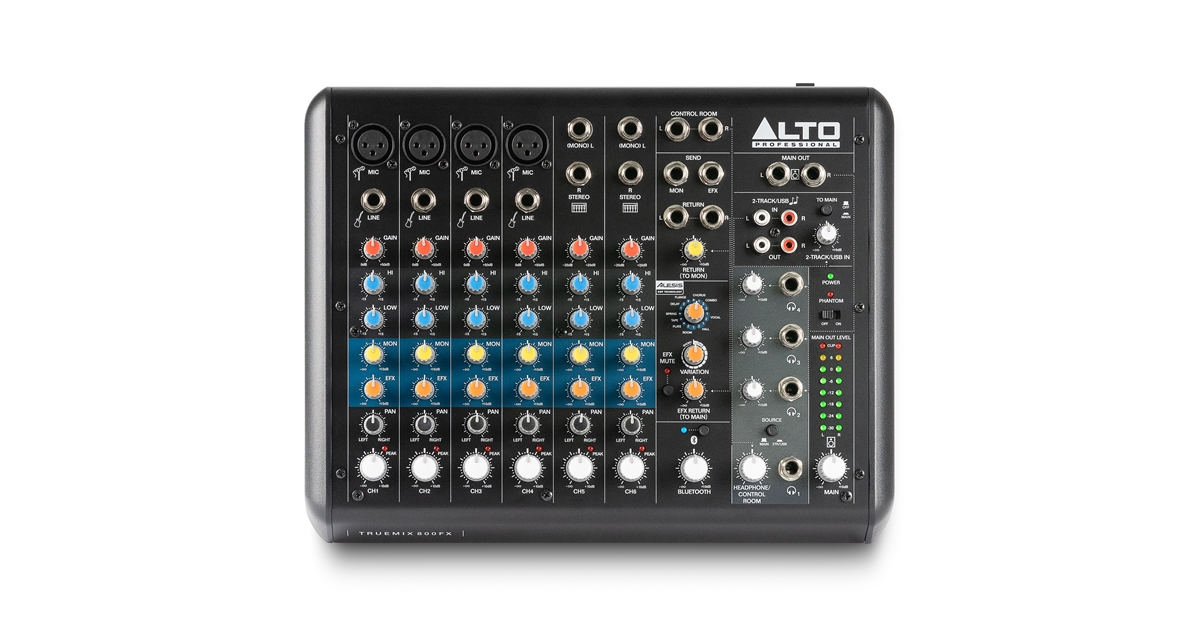 <p>Mixer analogico a 7 canali con processore a 16 effetti: 4 mono (Mic/Instrument), 2 stereo line e 1 canale stereo Bluetooth. Gain, equalizzatore 2 bande (basse e alte), Pan e mandate Aux e FX su ogni canale. 4 uscite cuffia con controlli di volume separati. Ingressi line bilanciati, Phantom attivabile sugli ingressi microfonici. Ingresso e uscita stereo 2-TRACK su connettori RCA con routing indirizzabile verso Main Mix o uscita cuffia. Porta USB audio class compliant che aggiunge al tuo computer PC, Mac e altri device un ingresso e un'uscita stereo. Led meter ad 8 segmenti.</p>