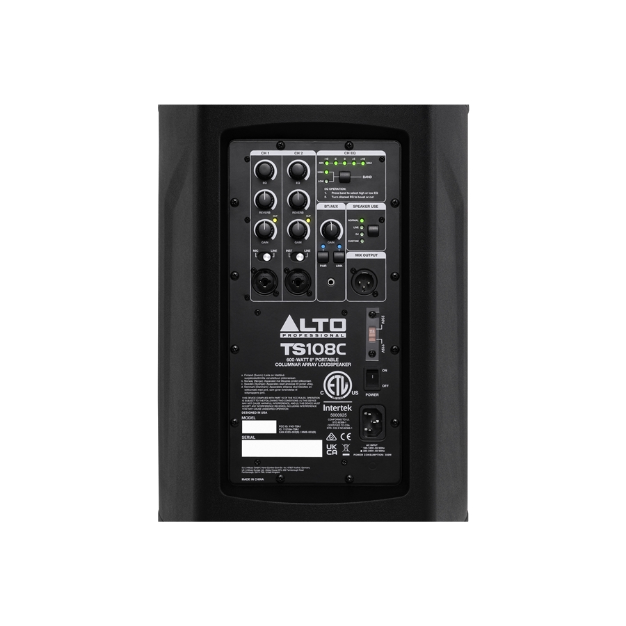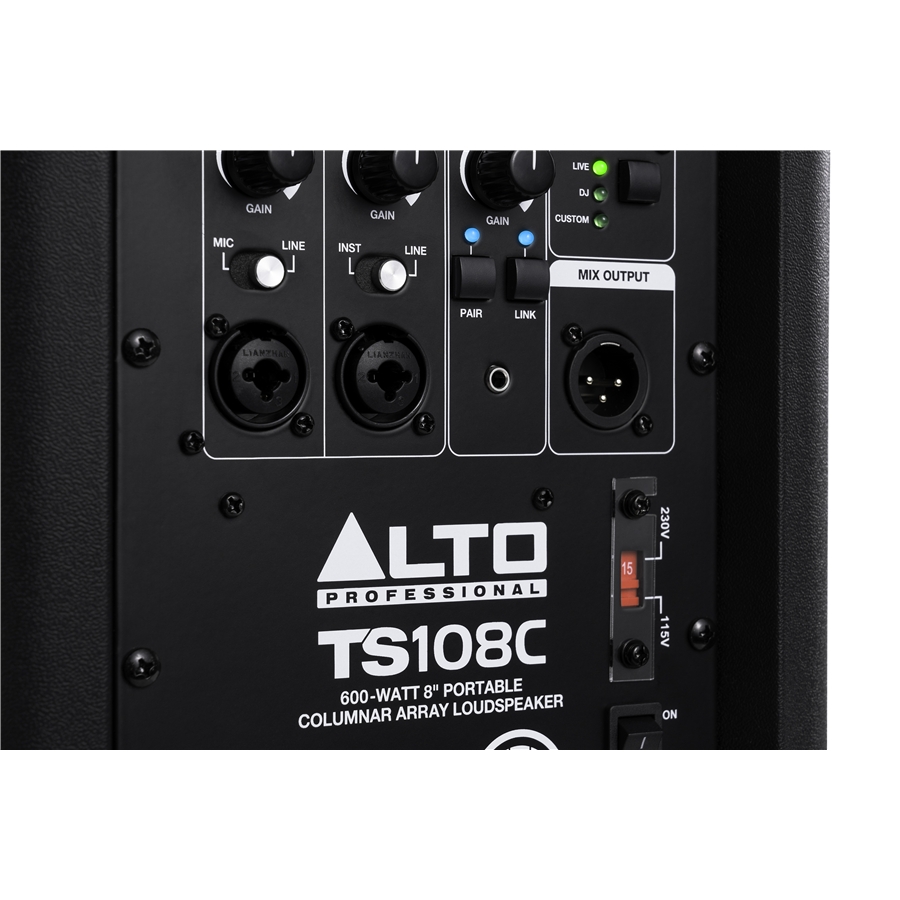 <h1 style="text-align: justify;"><strong>Alto Professional TS108C</strong> è un sistema a <strong>colonna attivo</strong> (600W di picco/300W RMS), portatile, modulare, composto da una base con <strong>subwoofer da 8"</strong>, che integra un <strong>mixer digitale a 3 canali</strong> con riverbero e <strong>streaming Bluetooth</strong>, due distanziatori e un array da <strong>6 driver da 2,75"</strong>. Progettato per generare una potenza sonora di <strong>123dB SPL</strong>, con una copertura di 120°×30°, <strong>TS108C </strong>offre una risposta in frequenza estesa dai 55Hz ai 15kHz (-3dB)/35 Hz-20 kHz (-10dB). Il diffusore a colonna amplificato perfetto per chi cerca potenza, praticità e versatilità in un formato compatto.</h1><p style="text-align: center;"><iframe allow="accelerometer; autoplay; clipboard-write; encrypted-media; gyroscope; picture-in-picture; web-share" allowfullscreen="" frameborder="0" height="989" referrerpolicy="strict-origin-when-cross-origin" src="https://www.youtube.com/embed/iyRH9w4e6uI" title="Introducing the ALTO TS108C Series Loudspeakers and Subwoofers | Alto Professional" width="1758"></iframe></p><p style="text-align: justify;"><strong>Alto Pro TS108C</strong> è una <strong>cassa a colonna amplificata</strong> compatta progettata per offrire un’ottima copertura sonora, che si colloca nella serie professionale <strong>TrueSonic</strong> del catalogo <strong>Alto Professional</strong>. Nonostante la sua compattezza, la potenza di 600 watt di picco (300W RMS suddivisi in 200W sulle basse e 100W sulle alte) la rende una soluzione ideale per i musicisti che lavorano con impianti propri, per i DJ e per tutti quegli eventi in ambienti medio/piccoli che richiedono un suono performante in un formato compatto. L’integrazione di <strong>un subwoofer da 8",</strong> un <strong>mixer digitale a 3 canali</strong> con <strong>riverbero</strong> e lo <strong>streaming Bluetooth</strong> consente un utilizzo immediato: collega, accendi e suona.</p><p style="text-align: justify;">Le <strong>4 modalità DSP </strong>dedicate (Normal, Live, DJ e Custom) permettono di adattare il profilo sonoro di questo diffusore a colonna amplificato a ogni stile musicale e situazione live mediante la semplice pressione di un tasto. Che si tratti di un set acustico in un bar, una lezione di fitness o un DJ set per 200 ospiti, la colonnina amplificata <strong>Alto Pro TS108C</strong> garantisce impostazioni rapide e intuitive grazie ai controlli del mixer integrati nel pannello posteriore e <strong>configurabili via Bluetooth</strong> attraverso l’<strong>Alto Pro App</strong>. </p><p style="text-align: justify;"><a href="https://play.google.com/store/apps/details?id=com.altomusic.altopro&hl=it"><strong>Scarica l’Alto Pro App da Google Play</strong>: clicca qui</a></p><p style="text-align: justify;"><a href="https://apps.apple.com/it/app/alto-pro/id1641706877"><strong>Scarica l’Alto Pro App dall’App Store</strong>: clicca qui</a></p><h1 style="text-align: justify;"><strong>Design portatile, ottima copertura sonora</strong></h1><p style="text-align: justify;">Robusta, predisposta per il trasporto nella comoda borsa a tracolla inclusa in dotazione, la colonnina amplificata <strong>Alto</strong> <strong>TS108C</strong> è progettata per durare nel tempo. Il design avanzato dell’array a colonna assicura una copertura sonora ampia (120°) e uniforme per un’esperienza d’ascolto ottimale in ogni occasione. </p><p style="text-align: justify;">La colonna si compone di tre sezioni che si inseriscono nell’apposita feritoia presente sulla base sub e si agganciano a scatto. Una delle sezioni è “attiva”, in quanto contiene i 6 driver da 7cm per le medio/alte, le altre due sono distanziali. Potrai quindi adattare l’altezza in base alla predisposizione dei diffusori rispetto al pubblico, con la libertà di posizionarli in platea o sul palco. Il cabinet in ABS stampato con griglia metallica a protezione dei driver, nella sezione superiore del sub ospita una comoda maniglia per il trasporto che ne conferma la predisposizione all’uso on-the-go. In dotazione viene fornita una sacca a tracolla per trasportare gli elementi della colonna. In quanto colonna, questo prodotto non è stato progettato per l’installazione sospesa o per montaggio su stativo.</p><h2 style="text-align: justify;"><strong>Il mixer integrato a 3 canali dell’Alto Pro TS108C</strong></h2><p style="text-align: justify;">Nel pannello posteriore della base-sub troviamo il mixer con <strong>due ingressi combo XLR/TRS</strong> con selettori MIC/LINE (CH1) e INST/LINE (CH2), gain dedicati, EQ a 2 bande per canale (premi il potenziometro per passare dalla regolazione delle alte a quella delle basse e viceversa) e riverbero. L’uscita <strong>XLR Mix Out</strong> invia il mix mono (CH1+CH2) a un secondo diffusore o a un impianto esterno. </p><h2 style="text-align: justify;"><strong>Bluetooth, Stereo-Link e App Alto Pro</strong></h2><p style="text-align: justify;">Lo <strong>streaming Bluetooth</strong> semplifica il set-up nella riproduzione musicale consentendoti di collegare in wireless l’audio riprodotto da computer, smartphone o tablet, e, tramite la funzione <strong>Stereo-Link</strong>, potrai collegare tra di loro in<strong> wireless due TS108C</strong> per una riproduzione stereo reale. Dall’<strong>Alto Pro App</strong> regoli le impostazioni dell’equalizzatore di uscita, i livelli e gli EQ dei canali, con la possibilità di salvare il tutto in un preset richiamabile con la modalità Custom.</p><p style="text-align: justify;"><a href="https://play.google.com/store/apps/details?id=com.altomusic.altopro&hl=it"><strong>Scarica l’Alto Pro App da Google Play</strong>: clicca qui</a></p><p style="text-align: justify;"><a href="https://apps.apple.com/it/app/alto-pro/id1641706877"><strong>Scarica l’Alto Pro App dall’App Store</strong>: clicca qui</a></p><h2 style="text-align: justify;"><strong>S