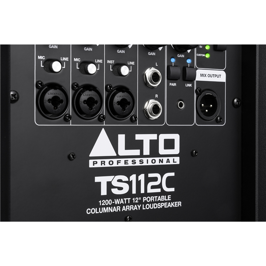 <h1 style="text-align: justify;"><strong>Alto Professional TS112C</strong> è un <strong>diffusore a colonna attivo</strong> (1200W di picco/600W RMS), portatile, composto da una base con <strong>subwoofer da 12"</strong>, che integra un <strong>mixer digitale a 5 canali</strong> con <strong>riverbero</strong> e <strong>streaming Bluetooth</strong>. Si sviluppa in verticale con due moduli: un distanziatore e un array con 8 driver da 2,75". Progettato per generare una potenza sonora di 127dB SPL, con una copertura di 120°×30°, <strong>TS112C</strong> offre una risposta in frequenza dai 50Hz ai 15kHz (-3dB); 30Hz-20kHz (-10dB). Un diffusore a colonna amplificato perfetto per chi cerca potenza, praticità e versatilità in un formato compatto.</h1><p style="text-align: center;"><iframe allow="accelerometer; autoplay; clipboard-write; encrypted-media; gyroscope; picture-in-picture; web-share" allowfullscreen="" frameborder="0" height="989" referrerpolicy="strict-origin-when-cross-origin" src="https://www.youtube.com/embed/jqrA7sibqm8" title="Introducing the ALTO TS112C Series Loudspeakers and Subwoofers | Alto Professional" width="1758"></iframe></p><p style="text-align: justify;"><strong>Alto Pro TS112C</strong> è un sistema PA a colonna compatto e potente, progettato per offrire un’elevata pressione sonora con la portabilità che musicisti, DJ, istruttori e locali moderni richiedono. Con i suoi <strong>1200 watt di potenza di picco</strong> (600W RMS: 400 sulle basse e 200 sulle alte), distribuiti in una torre elegante e trasportabile, la colonna <strong>Alto</strong> <strong>TS112C</strong> è un’ottima soluzione per service, locali, teatri, pub, piccoli club e ristoranti che necessitano di audio professionale in un formato dall’ingombro contenuto. Il subwoofer da 12", il mixer digitale a 5 canali con riverbero e <strong>connessioni Bluetooth</strong> con <strong>Stereo Link</strong> costituiscono un sistema di amplificazione completo, pronto per un utilizzo immediato: collega, accendi e suona.</p><p style="text-align: justify;">Robusta e portatile, con struttura modulare e una borsa a tracolla inclusa in dotazione per il trasporto del distanziatore e del modulo driver, questa colonna attiva garantisce una copertura ampia e uniforme (120°×30°), per un suono professionale e bilanciato in ogni occasione.</p><h2 style="text-align: justify;"><strong>Design portatile, ottima copertura Sonora</strong></h2><p style="text-align: justify;">La colonna si articola in due sezioni: una “attiva” con 8 driver per le medio/alte da 7cm di diametro e un distanziale, che si agganciano facilmente alla base sub. L’altezza può essere adattata mediante l’inserimento del distanziale in base al posizionamento nei confronti del pubblico: in platea o sul palco. Il cabinet in ABS stampato con griglia metallica protegge i driver, mentre la maniglia superiore del sub e la borsa inclusa ne confermano la predisposizione all’uso portatile.</p><h2 style="text-align: justify;"><strong>Il mixer integrato a 5 canali dell’Alto Pro TS112C</strong></h2><p style="text-align: justify;">Il pannello posteriore ospita <strong>tre ingressi analogici</strong> <strong>combo</strong> (XLR/TRS) con selettori MIC/LINE sui primi due canali, INST/LINE sul terzo. Il quarto canale è stereo con ingressi L e R su Jack TRS da 1/4” (CH4) e un quinto è utilizzabile per il collegamento di computer, smartphone o tablet via <strong>Bluetooth</strong>, oppure per un segnale analogico mediante la connessione AUX minijack TRS. Su ogni canale è presente un controllo del volume (Gain) dedicato. Un <strong>equalizzatore a 2 bande</strong> (premi il potenziometro per passare dalla regolazione delle alte a quella delle basse o viceversa) è disponibile su ciascuno dei primi 4 canali. Sui primi tre è inoltre disponibile un <strong>riverbero</strong>. L’uscita <strong>XLR Mix Out</strong> invia il mix mono (CH1–4) a un secondo diffusore o a un impianto esterno. Le <strong>4 modalità DSP</strong> (Normal, Live, DJ e Custom) consentono di adattare la resa sonora al contesto in cui ci troviamo sfruttando equalizzazioni preset, tra le quali troviamo anche una Custom configurabile a nostro piacimento mediante l’eq disponibile nell’App Alto Pro.</p><h2 style="text-align: justify;"><strong>Bluetooth, Stereo-Link e App Alto Pro</strong></h2><p style="text-align: justify;">Lo streaming Bluetooth semplifica la riproduzione musicale da smartphone, tablet o computer. Con la funzione <strong>Stereo-Link</strong>™ puoi collegare in wireless due <strong>TS112C</strong> per una riproduzione stereo reale. Tramite l’<strong>Alto Pro App </strong>controlli le impostazioni di EQ, i volumi e la modalità “Custom”, con la possibilità di salvare preset personalizzati.</p><p style="text-align: justify;"><a href="https://play.google.com/store/apps/details?id=com.altomusic.altopro&hl=it" target="_blank"><strong>Scarica l’Alto Pro App da Google Play</strong>: clicca qui</a></p><p style="text-align: justify;"><a href="https://apps.apple.com/it/app/alto-pro/id1641706877" target="_blank"><strong>Scarica l’Alto Pro App dall’App Store</strong>: clicca qui</a></p><h2 style="text-align: justify;"><strong>Specifiche tecniche Alto Professional TS112C</strong></h2><p style="text-align: justify;">- Potenza di picco: 1200W <br />- Potenza RMS: 600W (400W LF + 200W HF)<br />- Trasduttori: Subwoofer 12" (4 Ω) + array 8 × 2,75" (8 Ω)<br />- Impedenza array: 4 Ω<br />- SPL max (1 m): 127 dB<br />- Sensibilità: 94 dB (1 W/1 m)<br />- Copertura (H×V): 120° × 30°<br />- Risposta in frequenza (-3 dB): 50 Hz – 15 kHz<br />- Risposta in frequenza (-10 dB): 30 Hz – 20 kHz<br />- Ingressi:<br /> • CH1–2 – XLR/TRS combo, selettore MIC/LINE<br /> • CH3 – XLR/TRS combo, selettore INST/LINE<br /> • CH4 – ingresso stereo TRS<br /> • CH5 – Bluetooth/AUX mini-jack 3,5 mm<br />- Controlli:<br /> • Gain per canale<br /> • EQ 2 ba