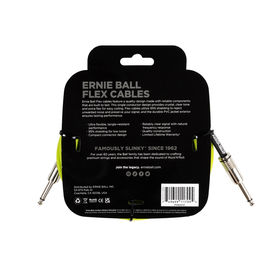 <h1 style="text-align: justify;">Il 6414 &egrave; il cavo assemblato per strumento della serie &quot;Flex&quot; di Ernie Ball in colorazione Green con lunghezza di 3 metri e plug dritti su entrambi i lati. Grazie al singolo conduttore, risulta particolarmente flessibile e la schermatura al 95% garantisce la massima pulizia di suono.</h1><center><iframe allow="accelerometer; autoplay; clipboard-write; encrypted-media; gyroscope; picture-in-picture; web-share" allowfullscreen="" frameborder="0" height="720" src="https://www.youtube.com/embed/RTUPbCV_e-g" title="Ernie Ball | Flex Cables" width="1280"></iframe></center><p>&nbsp;</p><h2 style="text-align: justify;">PANORAMICA DEL CAVO FLEX 6414 DI ERNIE BALL</h2><p>&nbsp;</p><p style="text-align: justify;">I cavi Ernie Ball Flex sono caratterizzati da un design di qualit&agrave; e da componenti affidabili, destinati a durare nel tempo. Il design a conduttore singolo offre un tono chiaro e cristallino e una maggiore flessibilit&agrave; per facilitare l&#39;avvolgimento. I cavi Flex utilizzano il 95% di schermatura per respingere i rumori indesiderati e preservare il segnale e il rivestimento esterno in PVC garantisce prestazioni durature.</p><h2>PUNTI DI FORZA DEL CAVO FLEX 6414 DI ERNIE BALL</h2><ul>    <li>Disponibile in versione da 3 e 6 metri</li>    <li>Cavo ultra flessibile e resistente ai grovigli</li>    <li>Schermatura al 95% per un basso livello di rumore</li>    <li>Segnale chiaro e affidabile con risposta in frequenza naturale</li>    <li>Design compatto del connettore</li>    <li>Costruzione di qualit&agrave;</li>    <li>Garanzia a vita limitata</li></ul><h2>SPECIFICHE DEL CAVO FLEX 6414 DI ERNIE BALL</h2><p><strong>Colore</strong>: Green<br /><strong>Lunghezza</strong>: 3 metri<br /><strong>Tiplogia plug</strong>: dritto/dritto<br /><strong>Materiale rivestimento</strong>: PVC</p>