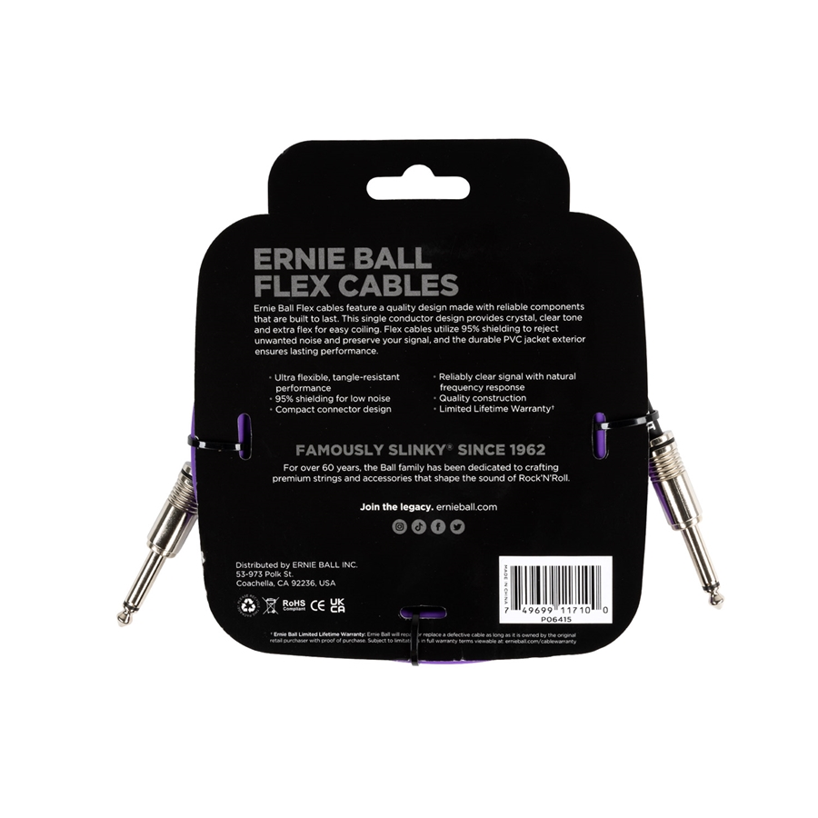 <h1 style="text-align: justify;">Il 6415 &egrave; il cavo assemblato per strumento della serie &quot;Flex&quot; di Ernie Ball in colorazione Purple con lunghezza di 3 metri e plug dritti su entrambi i lati. Grazie al singolo conduttore, risulta particolarmente flessibile e la schermatura al 95% garantisce la massima pulizia di suono.</h1><center><iframe width="1280" height="720" src="https://www.youtube.com/embed/RTUPbCV_e-g" title="Ernie Ball | Flex Cables" frameborder="0" allow="accelerometer; autoplay; clipboard-write; encrypted-media; gyroscope; picture-in-picture; web-share" allowfullscreen></iframe></center><br><h2 style="text-align: justify;">PANORAMICA DEL CAVO FLEX 6415 DI ERNIE BALL</h2><p style="text-align: justify;">I cavi Ernie Ball Flex sono caratterizzati da un design di qualit&agrave; e da componenti affidabili, destinati a durare nel tempo. Il design a conduttore singolo offre un tono chiaro e cristallino e una maggiore flessibilit&agrave; per facilitare l&#39;avvolgimento. I cavi Flex utilizzano il 95% di schermatura per respingere i rumori indesiderati e preservare il segnale e il rivestimento esterno in PVC garantisce prestazioni durature.</p><h2>PUNTI DI FORZA DEL CAVO FLEX 6415 DI ERNIE BALL</h2><ul>    <li>Disponibile in versione da 3 e 6 metri</li>    <li>Cavo ultra flessibile e resistente ai grovigli</li>    <li>Schermatura al 95% per un basso livello di rumore</li>    <li>Segnale chiaro e affidabile con risposta in frequenza naturale</li>    <li>Design compatto del connettore</li>    <li>Costruzione di qualit&agrave;</li>    <li>Garanzia a vita limitata</li></ul><h2>SPECIFICHE DEL CAVO FLEX 6415 DI ERNIE BALL</h2><p><strong>Colore</strong>: Purple<br /><strong>Lunghezza</strong>: 3 metri<br /><strong>Tiplogia plug</strong>: dritto/dritto<br /><strong>Materiale rivestimento</strong>: PVC</p>