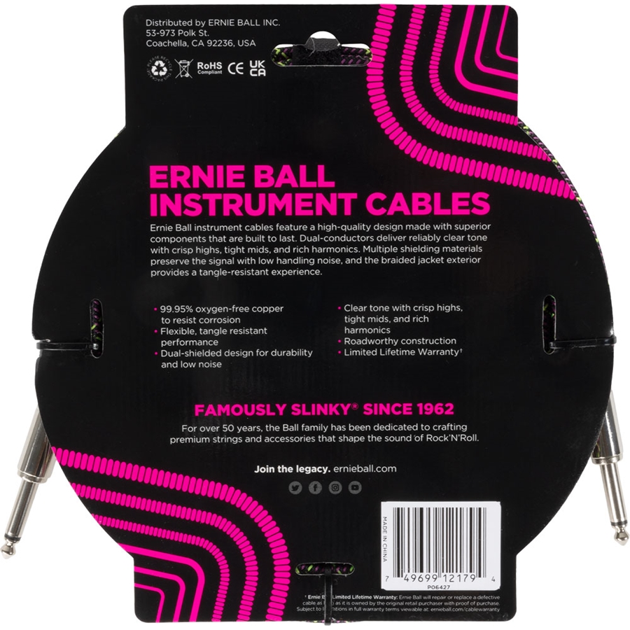 <h1 style="text-align: justify;">6427 Braided Cable Purple Python &egrave; il cavo per strumento con tessuto intrecciato di Ernie Ball, dalla lunghezza di 3m e con connettori sbilanciati straight. Grazie alla doppia schermata il braided cable &egrave; pi&ugrave; resistente, pi&ugrave; longevo e garantisce un basso livello di rumore, ideale per il palco o lo studio di registrazione.</h1><h2>Panoramica del 6427 Braided Cable Purple Python di Ernie Ball</h2><p style="text-align: justify;">Novit&agrave; per il 2024! I cavi per strumenti Ernie Ball sono caratterizzati da un design di alta qualit&agrave; realizzato con ottimi componenti, costruiti per durare nel tempo. I doppi conduttori offrono un tono chiaro e affidabile con alti nitidi, medi intensi e armoniche ricche. Molteplici materiali di schermatura preservano il segnale con un basso rumore di gestione, mentre la guaina intrecciata esterna garantisce la resistenza ai grovigli.</p><h2>Punti di forza del 6427 Braided Cable Purple Python di Ernie Ball</h2><ul>    <li>Rame al 99,95% privo di ossigeno per resistere alla corrosione</li>    <li>Cavo flessibile e resistente ai grovigli</li>    <li>Design a doppia schermatura per una maggiore durata e un basso livello di rumore</li>    <li>Tono chiaro con alti nitidi, medi intensi e ricchi di armoniche</li>    <li>Garanzia a vita limitata</li></ul><h2>Specifiche del 6427 Braided Cable Purple Python di Ernie Ball</h2><p><strong>Connettori</strong>: Sbilanciati straight<br /><strong>Lunghezza</strong>: 3 m</p>
