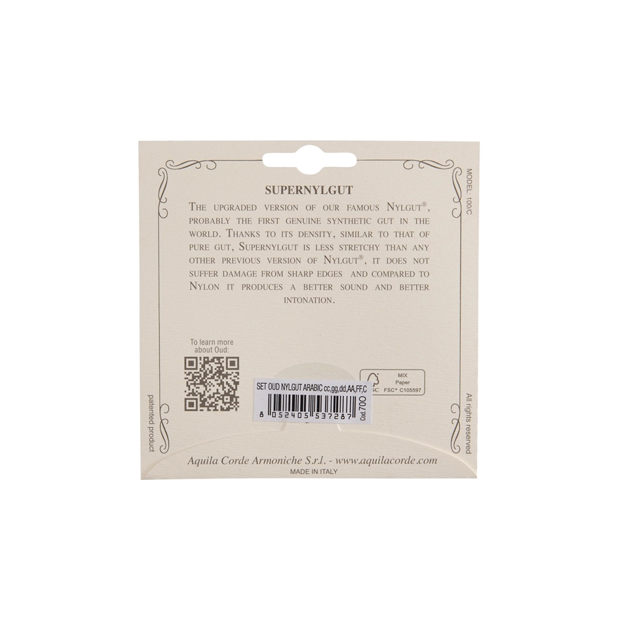 <h1 style="text-align: justify;">70O Super Nylgut Oud Arabic è il set di corde per oud arabic a 11 corde di Aquila Corde Armoniche con scalatuta 0,56-1,00w. È caratterizzata da un suono pieno e profondo, con basse frequenze avvolgenti.</h1><h2>Guarda il video del set SuperNylgut per Oud Arabico di Aquila Corde Armoniche</h2><center><iframe title="Aquila Supernylgut Oud Strings" src="https://www.youtube.com/embed/GGOVnI0Yjc0" width="1236" height="695" frameborder="0" allowfullscreen="allowfullscreen"></iframe></center><p> </p><h2>Panoramica delle 70O SuperNylgut Oud Arabic di Aquila Corde Armoniche</h2><p style="text-align: justify;">I set hanno una tensione di lavoro di 3,4 Kg per corda<strong>. </strong>I cantini sono realizzati in Supernylgut, mentre i bassi sono realizzati con filo di rame argentato (ad eccezione delle terze, per i set Oud Arabo e Turco, e delle quarte per il set Oud Iracheno, che sono in una lega metallica di color grigio).</p><h3>Il problema delle corde di Re del set per Oud Arabo e Iracheno, e dei Mi del set per Oud Turco</h3><p style="text-align: justify;">Le terze corde dei set per Oud Arabo (Re) e Turco (Mi), così come le quarte corde del set Oud Iracheno (Re), sono normalmente costituite da corde rivestite che da sempre risultano difficili da realizzare utilizzando i comuni materiali a disposizione (rame argentato o rame verniciato). Per ottenere il giusto tono con le giuste tensioni, si dovevano utilizzare fili di rivestimento talmente fini che portavano ad una rapida usura della corda, rendendola più fragile rispetto al resto del set. Grazie ad una costante ricerca sui materiali, Aquila Corde propone due soluzioni innovative, garantendo allo stesso tempo un’ottima resa acustica, grande stabilità e resistenza, e un buon bilanciamento col resto del set:</p><ul><li>La prima soluzione, che viene proposta <u>di default</u> su tutti i nostri set, è una corda rivestita con un filo metallico altamente resistente e performante, del tutto anallergico, in grado di soddisfare tutti coloro che sono abituati a suonare una corda filata in quella posizione;</li><li>La seconda soluzione prevede una corda sintetica realizzata con una speciale bio-plastica caricata con polvere di metallo al fine di aumentarne la densità. La corda sintetica presenta una superficie perfettamente liscia, colorazione rosso-bruno, e le prestazioni sono di gran lunga migliori rispetto alle tradizionali corde filate.</li></ul><h2>Specifiche delle 70O SuperNylgut Oud Arabic di Aquila Corde Armoniche</h2><p><strong>Diametri</strong>: C 1,00w - FF 0,83w - AA 0,70w - dd 0,63w - gg 0,74 - cc 0,56</p>