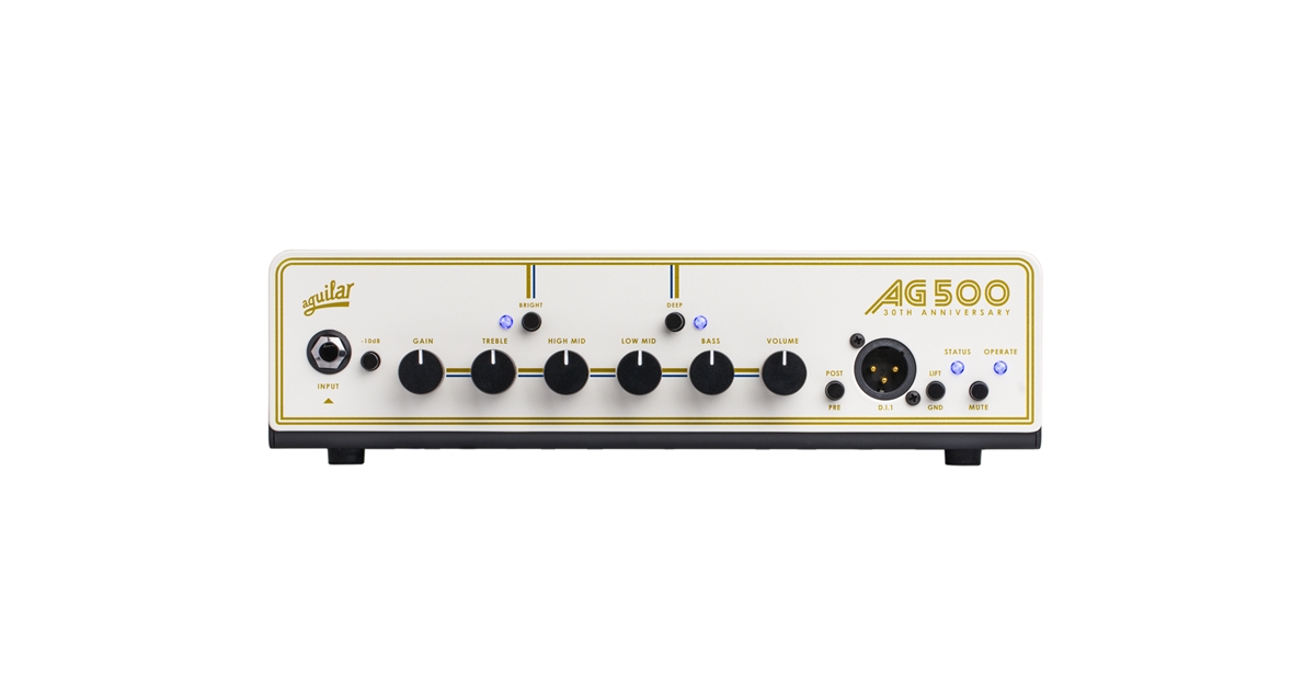 <h1 style="text-align:justify;">L'AG 500 V2 LE 30TH celebra i 30 anni di Aguilar con un design esclusivo che combina prestazioni leggendarie a un'estetica raffinata. Caratterizzata da un frontalino color panna e dettagli dorati, questa edizione limitata della AG 500 V2 si distingue per la qualità sonora senza compromessi e uno stile inconfondibile.</h1><h2 style="text-align:justify;">Punti di forza della testata AG 500 V2 LE 30TH</h2><p style="text-align:justify;">- Potenza di 500 Watt su 4 ohm in un formato leggero e portatile.<br />- Design esclusivo con frontalino color panna e dettagli dorati.<br />- Modulo IR Loader integrato con tre simulazioni di cabinet Aguilar modificabili via USB.<br />- Equalizzatore a 4 bande con controlli Bass, Low Mid, High Mid e Treble per una flessibilità sonora totale.<br />- Switch Deep e Bright per scolpire il suono con precisione.<br />- Doppia uscita DI XLR per segnali pre/post EQ, perfetta per monitoraggio in-ear e reamp.<br />- Ingresso Aux In e uscita cuffie con controllo volume dedicato per praticare in silenzio.<br />- Trasformatore automatic switching che si adatta alla tensione in ingresso.</p><h2 style="text-align:justify;">Specifiche tecniche della AG 500 V2 LE 30TH</h2><p style="text-align:justify;"><strong>Potenza:</strong> 500 Watt su 4 ohm<br /><strong>Sezione preamp:</strong> Stato solido<br /><strong>Sezione finale:</strong> Classe D<br /><strong>EQ:</strong><br />- Bass: +/- 17 dB @ 40 Hz<br />- Low Mid: +/- 15 dB @ 300 Hz<br />- High Mid: +/- 14 dB @ 800 Hz<br />- Treble: +/- 14 dB @ 4 kHz<br />- Deep: +6 dB <250 Hz<br />- Bright: +6 dB >3 kHz<br /><strong>Ingressi/Uscite:</strong><br />- Input: Jack 1/4", compatibile con bassi attivi e passivi<br />- Speaker Out: Due uscite Neutrik Speakon<br />- XLR Out: Uscita bilanciata con Pre/Post EQ e switch ground lift<br />- Tuner Out: Uscita per accordatore<br />- Effects Loop: Operatività in serie, +6 dB di gain addizionale<br /><strong>Dimensioni:</strong><br />- Peso: 2,2 kg<br />- Larghezza: 30,5 cm<br />- Profondità: 22,8 cm<br />- Altezza: 7,6 cm</p>