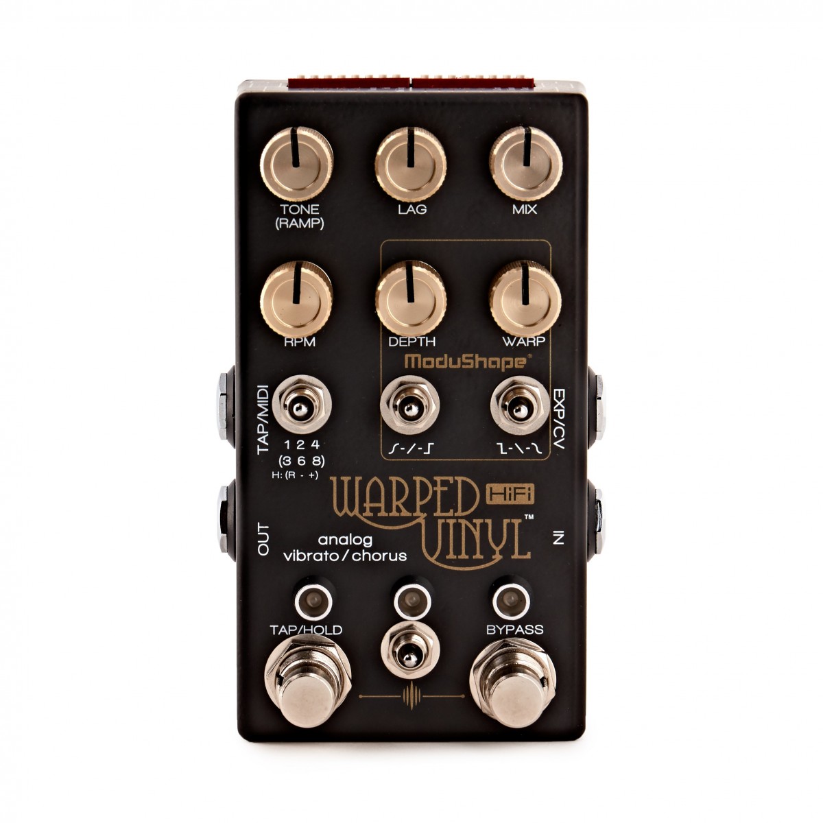 Il pedale permette anche il controllo delle funzioni di tempo e ha un controllo HOLD per una live manipolazione delle onde degli effetti.Il Warped Vinyl HiFi è un pedale Vibrato/Chorus "true pitch" con segnale completamente analogico in grado di creare un'infinita gamma di effetti vibrato e chorus.