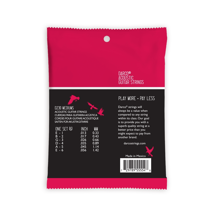 <p>Le corde per chitarra acustica D230 di Martin & Co Darco Acoustic sono la soluzione ideale per il musicista professionista che è solito cambiare le proprie mute frequentemente per avere costantemente il suono tipico della corda appena montata. Chitarre sempre nuove e pronte grazie ai prodotti Darco, che riducendo le corde a ciò che veramente è necessario ed evitando fronzoli inutili in grado di aumentare solamente i costi, hanno sviluppato corde potenti, chiare, equilibrate e longeve ad un prezzo ultracompetitivo. D230 sono formate da un'anima in acciaio stagnato e avvolgimento in Fosforo Bronzo di alta qualità, scalatura Medium e diametri: 13-17-26-35-45-56</p><p>Specifiche: <br />Modello: D230<br />Materiale: Phosphor Bronze<br />Scalatura: Medium<br />Diametri: 13-17-26-35-45-56<br />Tensione: 190.9<br /></p>