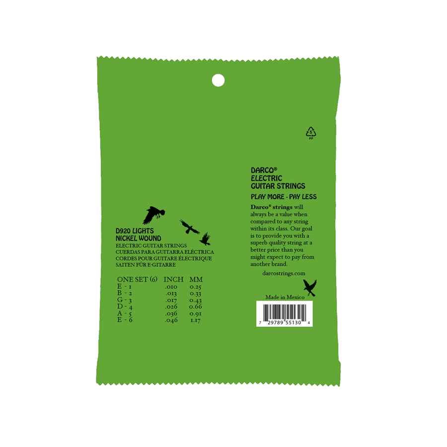 <p>Le corde per chitarra elettrica D920 di Martin & Co Darco Electric sono la soluzione ideale per il musicista professionista che è solito cambiare le proprie mute frequentemente per avere costantemente il suono tipico della corda appena montata. Chitarre sempre nuove e pronte grazie ai prodotti Darco, che riducendo le corde a ciò che veramente è necessario ed evitando fronzoli inutili in grado di aumentare solamente i costi, hanno sviluppato corde potenti, chiare, equilibrate e longeve ad un prezzo ultracompetitivo. D920 sono formate da un'anima in acciaio stagnato e avvolgimento in Nickel, scalatura Light e diametri: 10-13-17-26-36-46</p><p>Specifiche: <br />Modello: D920<br />Materiale: Nickel Wound<br />Scalatura: Light<br />Diametri: 10-13-17-26-36-46<br /></p>