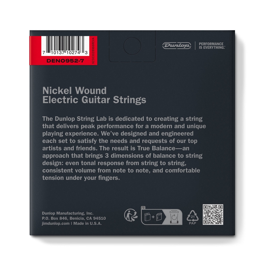 <h1 style="text-align: justify;"><strong>DEN0952&nbsp;Performance+ Electric Nickel</strong> &egrave; il set di corde <strong>09-52</strong> per <strong>chitarra elettrica 7 corde</strong> di casa <strong>Dunlop</strong>. Queste corde <strong>Extra Light</strong>, grazie al rivestimento in nichel, si distinguono per alte frizzanti, medie aggressive e basse precise.</h1><h2>PANORAMICA</h2><p style="text-align: justify;">Le corde <strong>Performance+</strong> sono state progettate pensando alle esigenze dei chitarristi. Raggiungono un equilibrio tra tensione e flessibilit&agrave; e proiettano l&#39;intera gamma tonale della chitarra elettrica. Le corde <strong>Dunlop</strong> vengono sviluppate con il feedback di grandi musicisti di tutto il mondo. Sono realizzate nella sede centrale di Benicia, in California, facendo lavorare le macchine a un ritmo pi&ugrave; lento e producento lotti pi&ugrave; piccoli. Questo procedimento permette di avere un controllo maggiore in ogni fase della produzione. Ongi set &egrave; sigillato accuratamente per garantirne la freschezza e la durata.<br /><strong>Nickel Wound</strong>.<br /><strong>Extra Light</strong>.</p><h2>SET</h2><p><strong>MI-E-1:</strong> 0.009<br /><strong>SI-B-2:</strong> 0.011<br /><strong>SOL-G-3:</strong> 0.016<br /><strong>RE-D-4:</strong> 0.024<br /><strong>LA-A-5:</strong> 0.032<br /><strong>MI-E-6:</strong> 0.042<br /><strong>SI-B-7:</strong> 0.052</p>