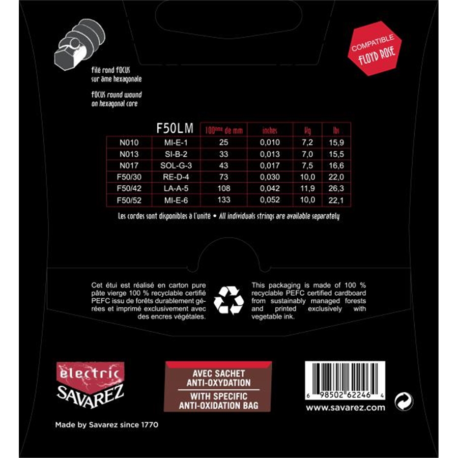 <h1><strong>F50LM</strong> &egrave; il set di corde per chitarra elettrica di casa <strong>Savarez</strong> con scalatura <strong>10/52</strong>. Sono rivestite in acciao inossidabile e presentano un <strong>nucleo esagonale</strong>, ideali per il chitarrista che cerca un suono rotondo e definito.</h1><h2>PANORAMICA</h2><p>Le corde per chitarra elettrica della serie FOCUS di Savarez sono realizzate in una nuova, innovativa lega di acciaio inossidabile, avvolta attorno a un nucleo esagonale. Le corde Focus offrono una sensazione unica e un perfetto equilibrio tra tutte le frequenze, una dinamica eccellente e suono brillante e preciso. Le corde Focus sono pi&ugrave; durevoli e rimangono perfettamente intonate, anche dopo un uso prolungato della leva. Non sono solo perfette per suonare il blues, il funk e il reggae, ma si adattano perfettamente al rock, al pop e al metal. Con le corde Focus sar&agrave; semplice far uscire la tua chitarra dal mix e soddisferanno le tue aspettative, qualunque sia il tuo stile musicale.</p><p>&nbsp;</p><center><iframe allow="accelerometer; autoplay; clipboard-write; encrypted-media; gyroscope; picture-in-picture" allowfullscreen="" frameborder="0" height="480" src="https://www.youtube.com/embed/9srBeYloAg8" title="YouTube video player" width="853"></iframe></center><p>&nbsp;</p><h2>PUNTI DI FORZA</h2><ul style="margin-left: 17px;">    <li>Rivestimento in acciao inossidabile</li>    <li>Nucleo Esagonale</li>    <li>Suono brillante, preciso e con gran dinamica</li>    <li>Maggior durata della corda</li>    <li>Adatte ad ogni stile musicale</li></ul>