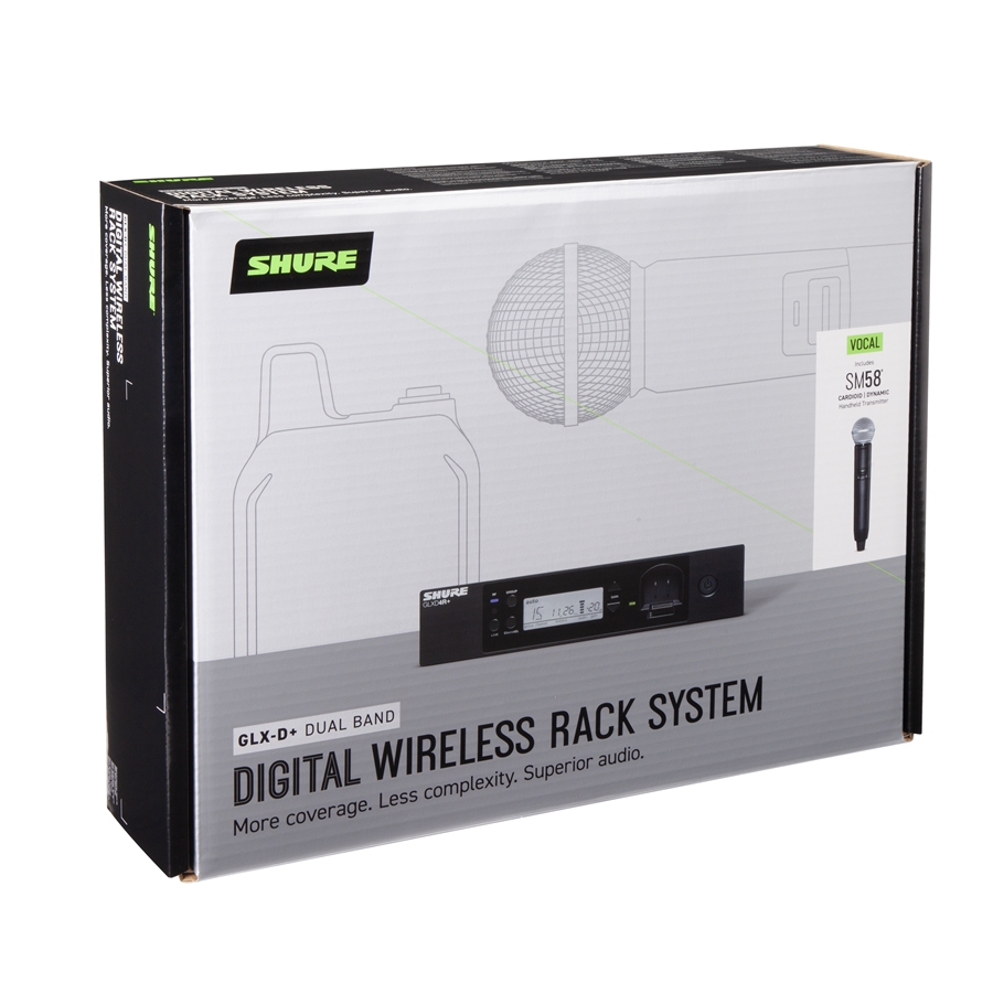 <p style="text-align: justify;">Dotato del microfono <strong>SM58</strong>,&nbsp;il sistema wireless digitale per voce <strong>GLXD24R+/SM58</strong> a doppia banda (2,4 GHz e 5,8 GHz) offre un audio digitale superiore e trasparente. La perfetta combinazione della gestione automatica delle frequenze con la nuova tecnologia a doppia banda garantisce prestazioni affidabili e coerenti, mentre le batterie ricaricabili al litio proprietarie di Shure offrono fino a 12 ore di utilizzo. Il sistema include il trasmettitore palmare <strong>GLXD2+/SM58</strong> e il ricevitore <strong>GLXD4R+ </strong>a mezza unit&agrave; rack.</p>