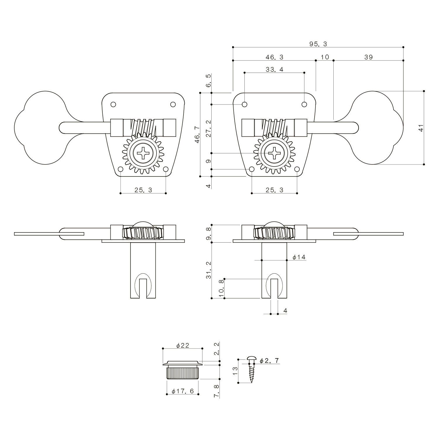 Set meccaniche 4 in linea per basso - Serie FB30 - Made in Japan - Gear Ratio: 1:20 - Configurazione: 4L per installazione a sinistra - Plate Teflon privo di olio (sia sull'alberino che sulla rotella) che rende più fluida la regolazione e prolunga la durata degli ingranaggi - Dotato del sistema di fissaggio dell'alberino brevettato Gotoh Rock-Solid che evita le vibrazioni indesiderate - Diametro foro su paletta per inserire la meccanica: 17,6mm - Diametro alberino: 14,0mm - Lunghezza alberino (fino al foro per inserire la corda): 20,4mm - Diametro foro per inserire la corda: 4,0mm - Angolo di montaggio: 0 gradi - Finitura: Nickel - La confezione include: 4x Meccanica + Tutte le parti necessarie per il montaggio (viti, rondelle, dadi,...).