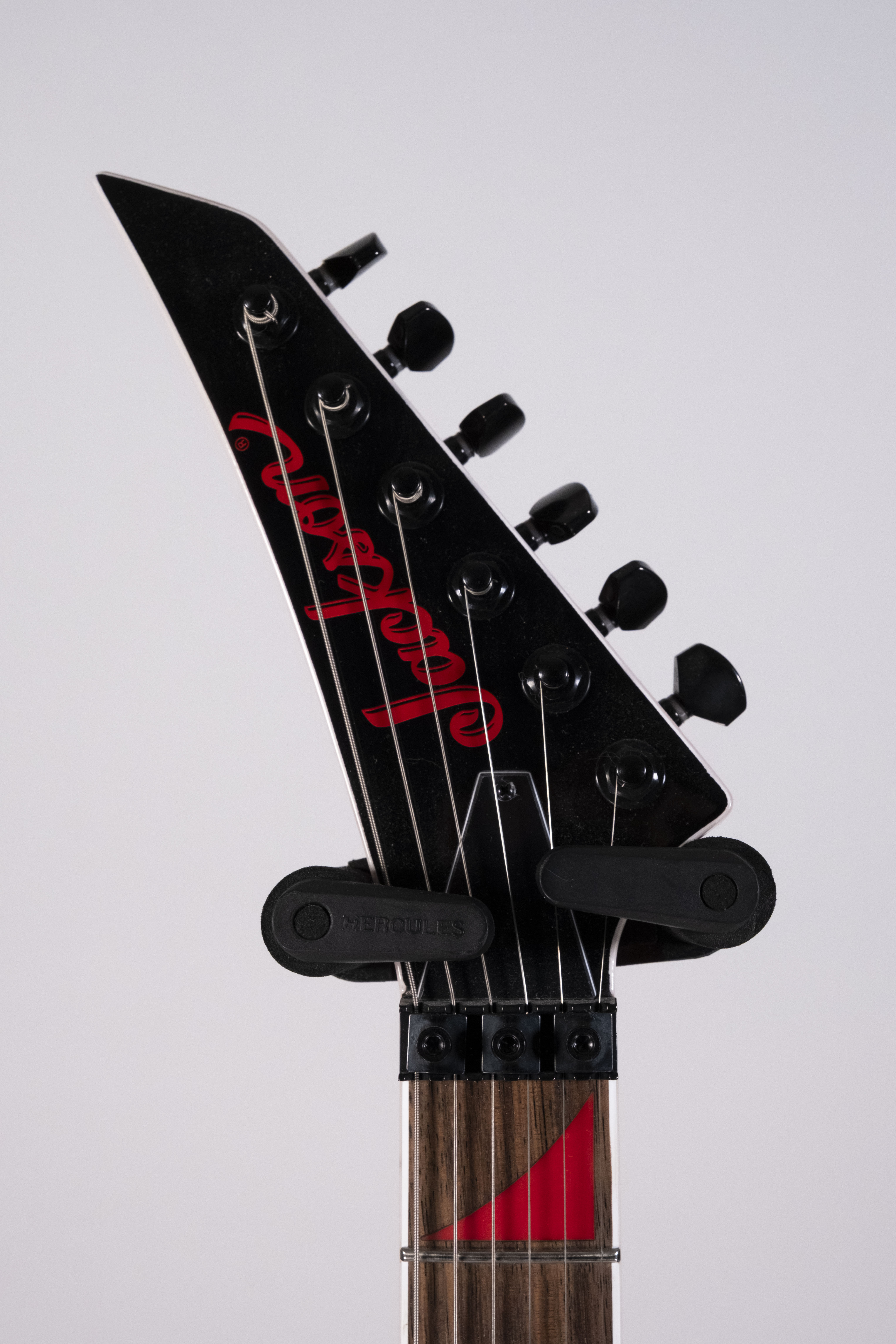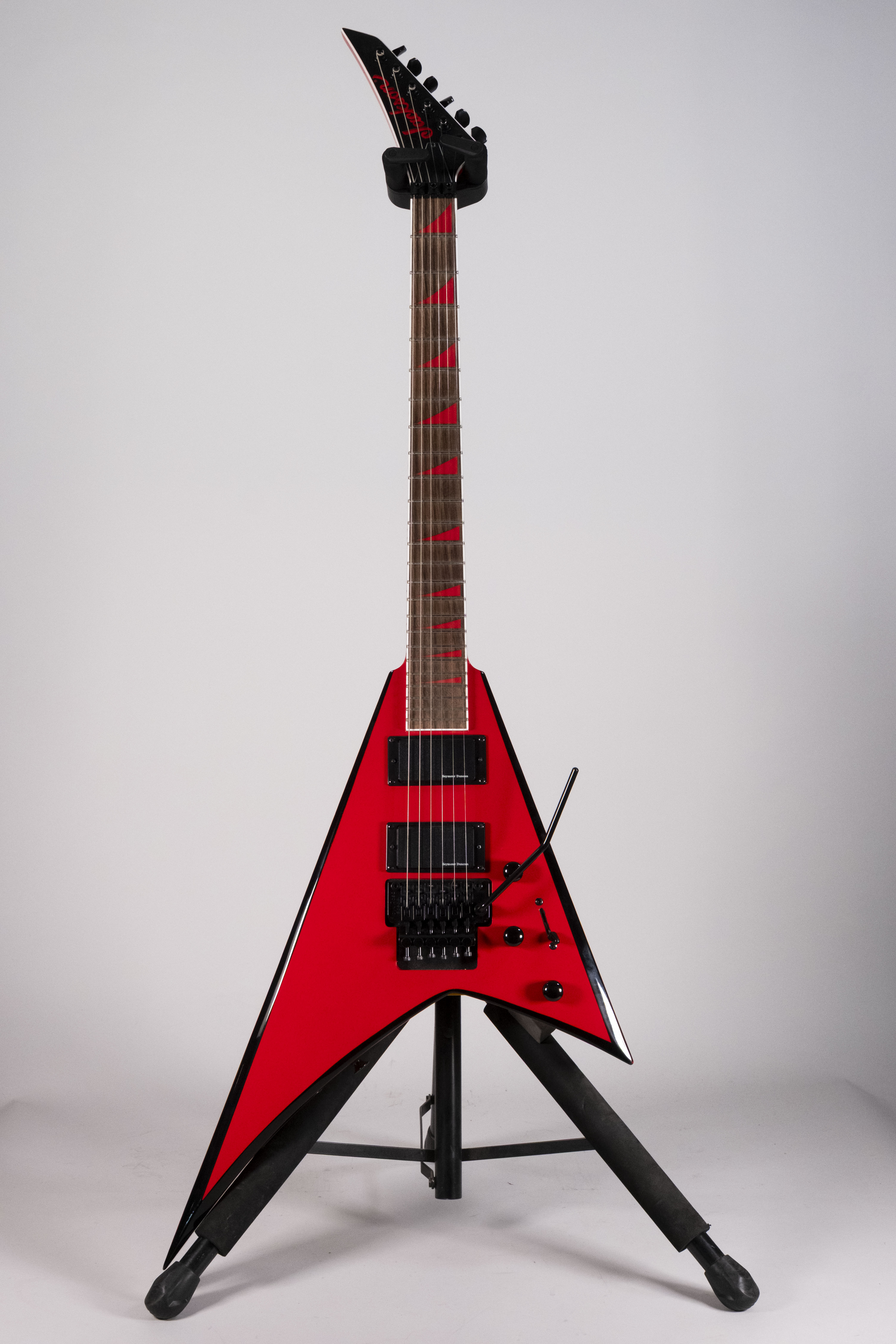 Il corpo a V asimmetrica con finitura rosso lucido con bande nere dona un look scenico e distintivo, mentre la costruzione neck-through-body migliora sustain, stabilità e accesso ai tasti più alti.