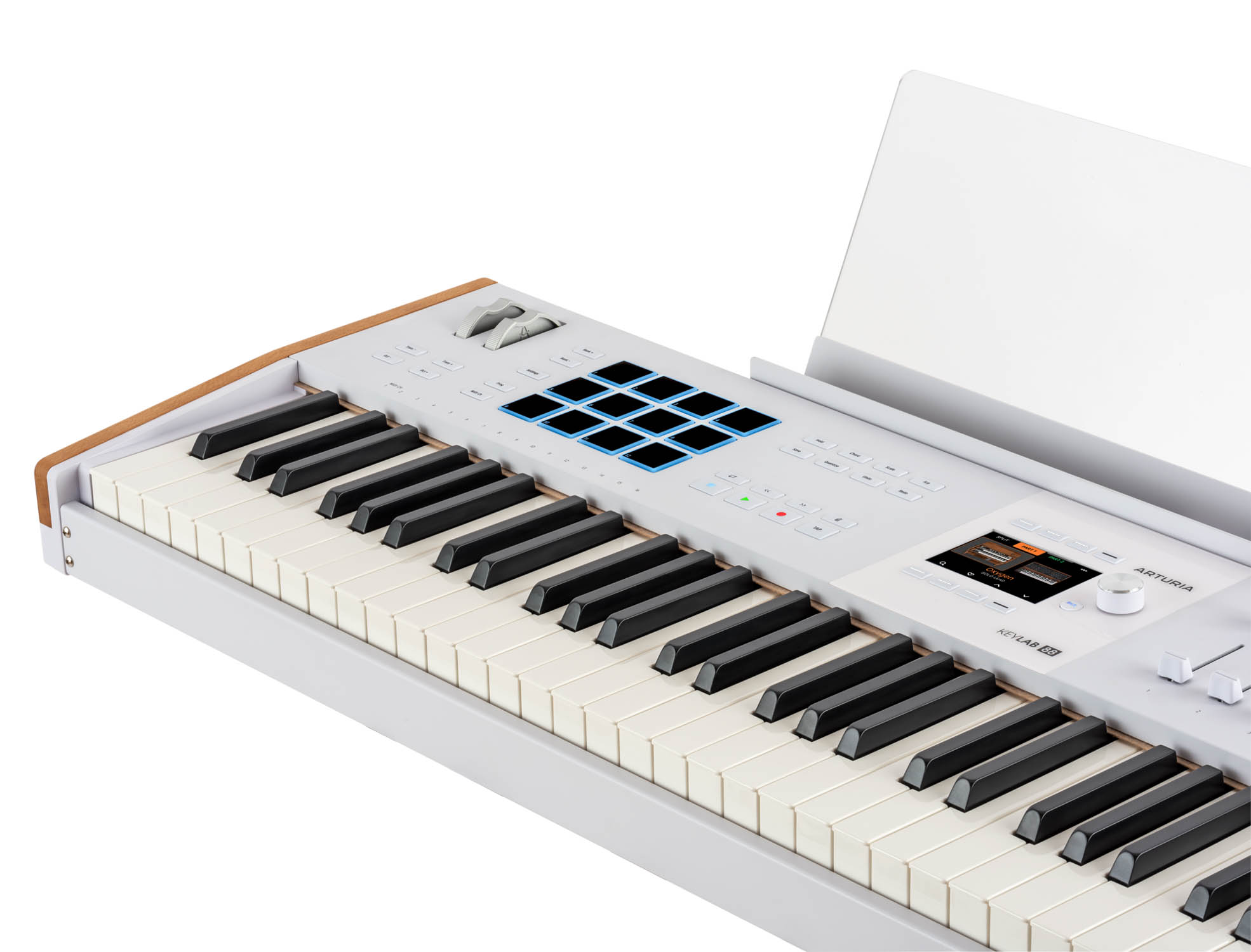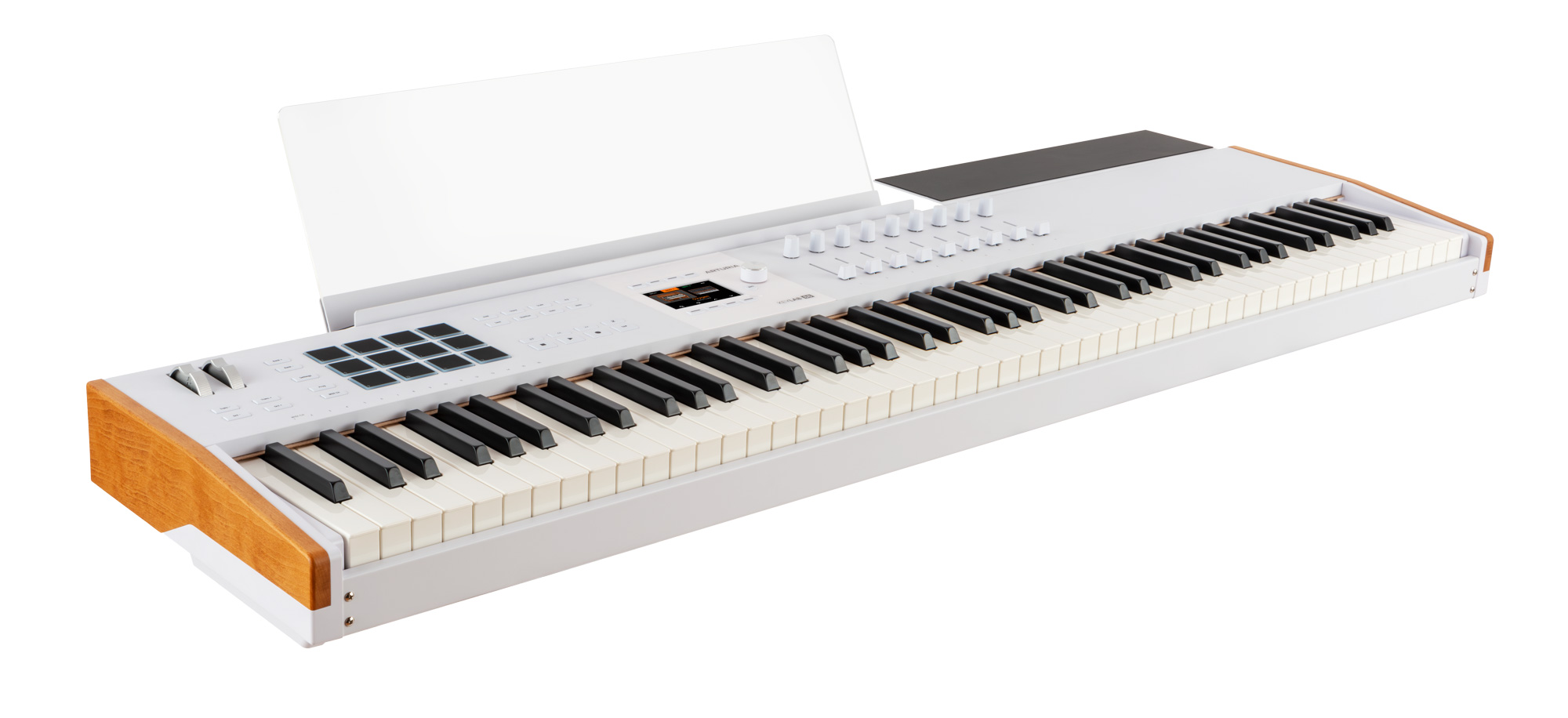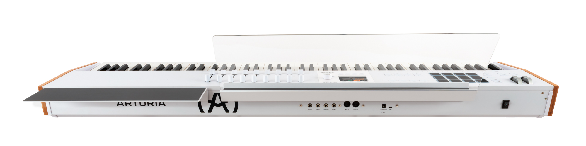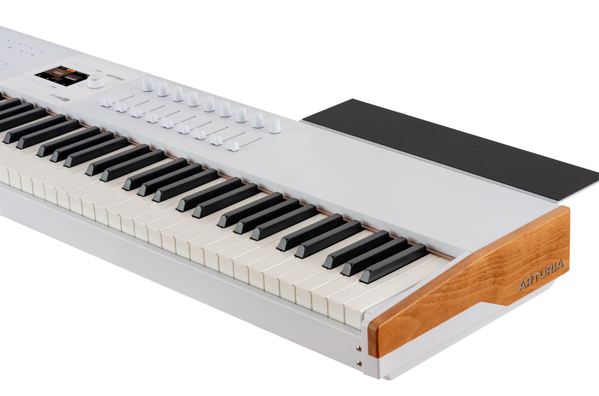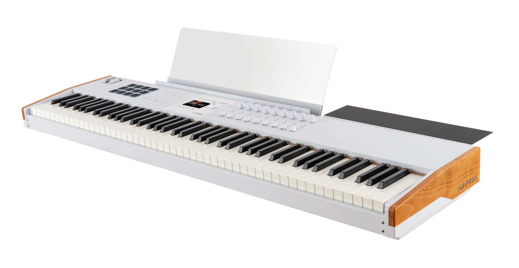 <h1 style="text-align: justify;"><strong><a href="https://algameko.com/it/app/b/arturia/">Arturia</a> KeyLab 88 mk3 White</strong> è una master keyboard MIDI premium a 88 tasti (7 ottave e 1/4) con meccanica hammer-action Fatar TP/110, aftertouch e display a colori da 3,5" per un controllo immediato di DAW, strumenti software e hardware. <strong>KeyLab 88 mk3</strong> è la versione <strong>full-range</strong> della serie <strong>KeyLab mk3</strong>: un controller MIDI costruito per chi suona davvero la tastiera e quindi dotato di piano-action e di una superficie di controllo completa in ambiente DAW. In questa variante bianca (White) – spesso ricercata per studi luminosi e set moderni – il colore bianco diventa un segno distintivo riconoscibile, mentre la costruzione con pannelli in legno e componenti in alluminio resta la stessa della versione nera.</h1><h2 style="text-align: justify;"><strong>Tastiera Fatar TP/110, dinamica e aftertouch</strong></h2><p style="text-align: justify;">La<strong> meccanica fully-weighted Fatar TP/110</strong> con azione a martelletto è pensata per trasferire su strumenti virtuali e hardware un tocco pianistico credibile. La sensibilità a <strong>velocity</strong>, <strong>release velocity </strong>e <strong>aftertouch </strong>(<strong>channel aftertouch</strong>) aggiunge un livello di espressività utile su archi, pad, synth e automazioni; inoltre, curve e risposta dell’aftertouch sono regolabili per adattarsi allo stile personale dell'utente.</p><h2 style="text-align: justify;"><strong>Display a colori e controllo immediato dei parametri</strong></h2><p style="text-align: justify;">Il display full color da 3,5" (480x320px) con 8 pulsanti contestuali semplifica il controllo dei software e la ricerca dei preset, feedback sui parametri, editing e settaggi sono sempre leggibili per avere un riscontro visivo su tutti i parametri. In modalità <strong>Arturia</strong>, la mappatura dei <strong>Macro </strong>di <strong>Analog Lab Pro </strong>rende immediato il controllo timbrico, mentre in <strong>User Mode</strong> puoi costruire programmi personalizzati e richiamarli al volo.</p><h2 style="text-align: justify;"><strong>Controlli touch-sensitive, pad e performance</strong></h2><p style="text-align: justify;"><strong>9 encoder 360°</strong> e <strong>9 fade</strong>r sono <strong>touch-sensitive</strong>: al semplice contatto possono richiamare informazioni e valori sullo schermo, aumentando precisione e consapevolezza durante mix e sound design. I <strong>12 pad</strong> sensibili a <strong>velocity </strong>e <strong>pressione</strong>, con <strong>4 bank</strong>, coprono <strong>finger drumming</strong>, <strong>clip launching </strong>e <strong>mapping estesi</strong>, con una logica che resta coerente tra live e studio.</p><h2 style="text-align: justify;"><strong>Integrazione DAW, MCU/HUI e NKS</strong></h2><p style="text-align: justify;"><strong>KeyLab 88 mk3</strong> integra mapping dedicati per <strong>Ableton Live, FL Studio, Logic Pro, Cubase e Bitwig Studio</strong> e supporta protocolli <strong>MCU </strong>e <strong>HUI</strong>, così da controllare mixer, plug-in e transport con feedback contestuale. La <strong>compatibilità NKS </strong>amplia ulteriormente l’integrazione con <strong>ecosistemi software di terze parti</strong>, mantenendo un workflow centralizzato.</p><h2 style="text-align: justify;"><strong>Funzioni creative per composizione e ideazione</strong></h2><p style="text-align: justify;"><strong>Scale Mode</strong> mantiene le note nella scala selezionata; <strong>Chord Play </strong>permette di eseguire accordi e progressioni con voicing “intelligenti”; <strong>l’Arpeggiatore </strong>include funzioni di randomizzazione utili per pattern generativi. Sono strumenti pensati per trasformare rapidamente una progressione in materiale suonabile, soprattutto quando lavori con <strong>split/layer </strong>su 88 tasti.</p><h2 style="text-align: justify;"><strong>Connessioni, pedali e utilizzo standalone</strong></h2><p style="text-align: justify;">La connessione USB-C gestisce alimentazione e dati al nostro controller; i connettori <strong>MIDI DIN In/Out </strong>permettono di controllare strumenti esterni o usare la tastiera come interfaccia MIDI/USB. Sono presenti ingressi per pedali sustain, expression e aux, configurabili e calibrabili. Per performance senza computer è possibile alimentare KeyLab tramite alimentatore opzionale 12V DC 1A.</p><h2 style="text-align: justify;"><strong>Software incluso e dotazione</strong></h2><p style="text-align: justify;">Il bundle incluso è pensato per iniziare subito a produrre e suonare: <strong>Analog Lab Pro</strong>, <strong>Ableton Live Lite </strong>e una selezione di strumenti/effetti (<strong>Mini V, Piano V, Augmented Strings, Rev PLATE-140</strong>), oltre a <strong>Native Instruments Komplete 15 Select </strong>(a scelta) e contenuti <strong>Loopcloud </strong>& <strong>Melodics</strong>. In confezione trovi anche leggio per spartiti e supporto per computer, oltre a cavo USB (C/A), quick start e card di registrazione. </p><h2 style="text-align: justify;"><strong>Specifiche tecniche Arturia KeyLab 88 mk3 White</strong></h2><p style="text-align: justify;">• Tastiera: 88 tasti fully-weighted hammer-action Fatar TP/110, sensibili a velocity, release velocity e aftertouch (channel aftertouch)<br>• Controlli: 9 encoder touch-sensitive + 9 fader touch-sensitive<br>• Pad: 12 pad RGB sensibili a velocity e pressione, con 4 Pad Bank<br>• Display: full color 3,5" 320x480 px con 8 pulsanti contestuali<br>• Funzioni creative: Scale mode, Arpeggiatore (con Random mode), Chord mode<br>• Integrazione: mapping dedicati per Ableton Live, FL Studio, Logic Pro, Cubase, Bitwig Studio; supporto MCU & HUI<br>• Comandi DAW: transport e comandi operativi (save, undo, redo, ecc.)<br>• Connettività: USB-C, MIDI DIN In/Out, ingressi pedali sustain/expression/aux<br>• Alimentazi