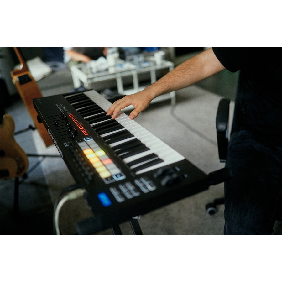 <h1 style="text-align: justify;"><strong>Novation LAUNCHKEY 49 MKIII</strong> è un controller MIDI USB per Ableton Live equipaggiato di una tastiera 49 tasti full size e 16 pad RGB sensibili alla velocity, 9 fader, 8 potenziometri rotativi, un arpeggiatore, modalità Chord e Scale, funzione Capture MIDI, Pitch e Mod wheel, e controlli di trasporto. Compatibilità HUI per integrazione e controllo remoto dei software DAW: Logic Pro, Cubase, Reason.</h1><h2 style="text-align: justify;"><strong>Tanta libertà di espressione in poco spazio</strong></h2><p style="text-align: justify;">Otto diverse modalità Scale ti accompagneranno nella composizione adattando automaticamente le note suonate alla scala selezionata. Basterà selezionare la tonica (root note) e la scala preferita, quindi iniziare a suonare. Sul fronte dell’armonia, le tre modalità Chord trasformano tasti e pad in una superficie interattiva per la creazione di progressioni armoniche. Grazie all'arpeggiatore è possibile esplorare nuove melodie e trovare rapidamente idee creative, mentre la funzione mutate consente di reinventare i pattern in nuove forme.</p><h2 style="text-align: justify;"><strong>Modalità personalizzabili</strong></h2><p style="text-align: justify;">I <strong>Custom Modes</strong> semplificano l'interazione tra controller e software, conferendoti un controllo ancora più completo. Programmabili tramite lo strumento basato sul software di Novation Components, questi modi personalizzati ti consentono di configurare il comportamento della tua <strong>tastiera Novation Launchkey</strong>, gestendo le assegnazioni dei controlli, il routing MIDI, il colore dei pad e molte altre funzionalità.</p><h2 style="text-align: justify;"><strong>Le connessioni di Launchkey 49</strong></h2><p style="text-align: justify;">Launchkey 49 dispone di un'uscita MIDI DIN a cinque pin per la connessione e il controllo di altri dispositivi MIDI. Grazie all’elevato potenziale in modalità standalone, <strong>Launchkey</strong> diventerà il fulcro del tuo set live oltre che in studio, con o senza l'uso del computer.</p><h2 style="text-align: justify;"><strong>Integrazione con Ableton Live</strong></h2><p style="text-align: justify;">La piattaforma <strong>Launchkey</strong> ha mantenuto sempre la sua flessibilità e la revisione MkIII prosegue con questa filosofia. Pad più ampi e sensibili alla velocity consentono un maggiore controllo sulla dinamica, mentre i 9 fader e gli 8 potenziometri mettono il software letteralmente a portata di mano. L'integrazione con <strong>Ableton Live</strong> è ottima, con un pulsante dedicato per attivare la funzione Capture MIDI, oltre ai controlli di armatura della traccia, quantizzazione, click e loop utili per muoverti rapidamente all'interno della tua sessione.</p><h2 style="text-align: justify;"><strong>Compatibilità con le più famose DAW grazie a HUI</strong></h2><p style="text-align: justify;">Oltre a offrire interazione e controllo immediati, senza eccessive configurazioni con applicativi audio/MIDI come Studio One, Cubase e Pro Tools tramite <strong>HUI</strong>, <strong>Novation Launchkey</strong> è pienamente integrato anche in altri software DAW: da Logic Pro a Reason. </p><h2 style="text-align: justify;"><strong>Software Components </strong></h2><p style="text-align: justify;">Components è un hub di gestione dei prodotti Novation, puoi accedere a nuovi sound pack, gestire i contenuti sonori, personalizzare il tuo dispositivo e rimanere aggiornato con il firmware più recente.</p><h2 style="text-align: justify;"><strong>Vasta selezione di suoni</strong></h2><p style="text-align: justify;">Launchkey 49 è un controller a tastiera che ti accompagnerà nel tuo percorso musicale. Grazie a una serie di software, tra cui Ableton Live 10 Lite, Spitfire Audio LABS Expressive Strings, XLN Audio Addictive Keys, Klevgrand Roverb e DAW Cassette e AAS Session Bundle, Launchkey 49 ti offre un'incredibile varietà di suoni.</p><h2 style="text-align: justify;"><strong>Aggiornamento firmware 1.1</strong></h2><p style="text-align: justify;">L'aggiornamento del firmware v1.1 introduce la funzione Strum Mode. Puoi tenere premute le note e attivare la modalità Strum utilizzando la mod wheel del Launchkey. La modalità Strum può essere utilizzata insieme ad altre modalità dell'arpeggiatore per aumentare la creatività.</p><h2 style="text-align: justify;"><strong>Caratteristiche di NOVATION Launchkey 49 MkIII</strong></h2><ul> <li style="text-align: justify;">49 tasti sensibili alla velocity</li> <li style="text-align: justify;">Schermo 16x2 caratteri </li> <li style="text-align: justify;">Pitch e modulation wheel</li> <li style="text-align: justify;">9 Fader</li> <li style="text-align: justify;">8 potenziometri</li> <li style="text-align: justify;">16 pad tattili RGB sensibili alla velocity</li> <li style="text-align: justify;">Pulsante transpose</li> <li style="text-align: justify;">Pulsanti ottava up/down</li> <li style="text-align: justify;">Pulsanti play, record e loop</li> <li style="text-align: justify;">Pulsanti arp, Scale e Fixed chord</li> <li style="text-align: justify;">Pulsanti Capture MIDI, quantise, click e undo</li> <li style="text-align: justify;">Pulsanti stop, solo e mute</li> <li style="text-align: justify;">Pulsante di selezione tracce</li> <li style="text-align: justify;">Pulsante per lanciare scene</li> <li style="text-align: justify;">Pulsanti selezione device e device lock</li></ul><h2 style="text-align: justify;"><strong>Connessioni di NOVATION Launchkey 49 MkIII</strong></h2><ul> <li style="text-align: justify;">Uscita MIDI a 5 pin </li> <li style="text-align: justify;">Ingresso jack da 1/4" per pedale sustain </li> <li style="text-align: justify;">Porta USB B (alimentazione, MIDI)</li> <li style="text-align: justify;"><strong>Compatibilità Software</strong>: Ableton 10, Logic, Reason e altre DAW compatibili con protocollo HUI</li> <li style="text-align: justify;"><strong>Di