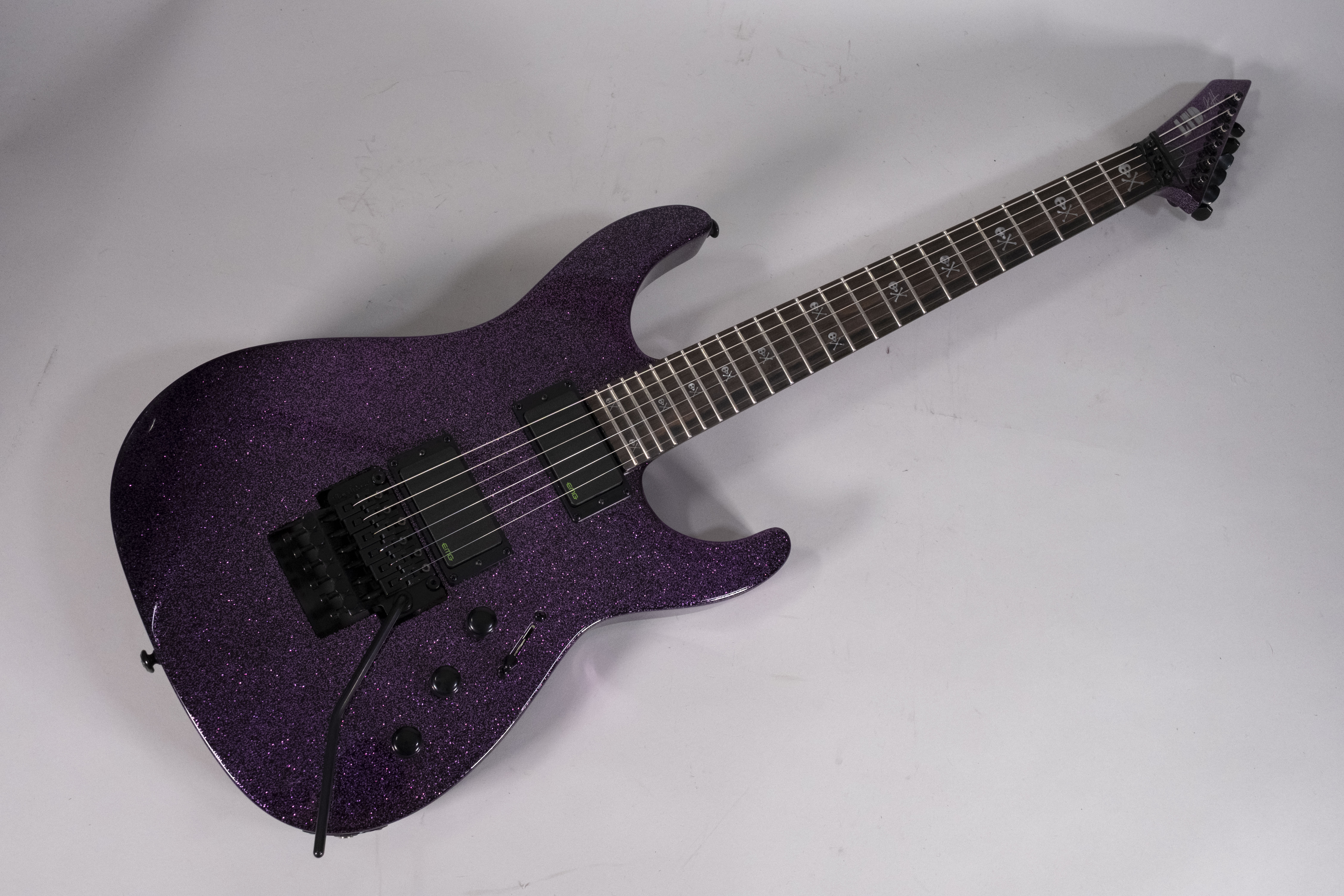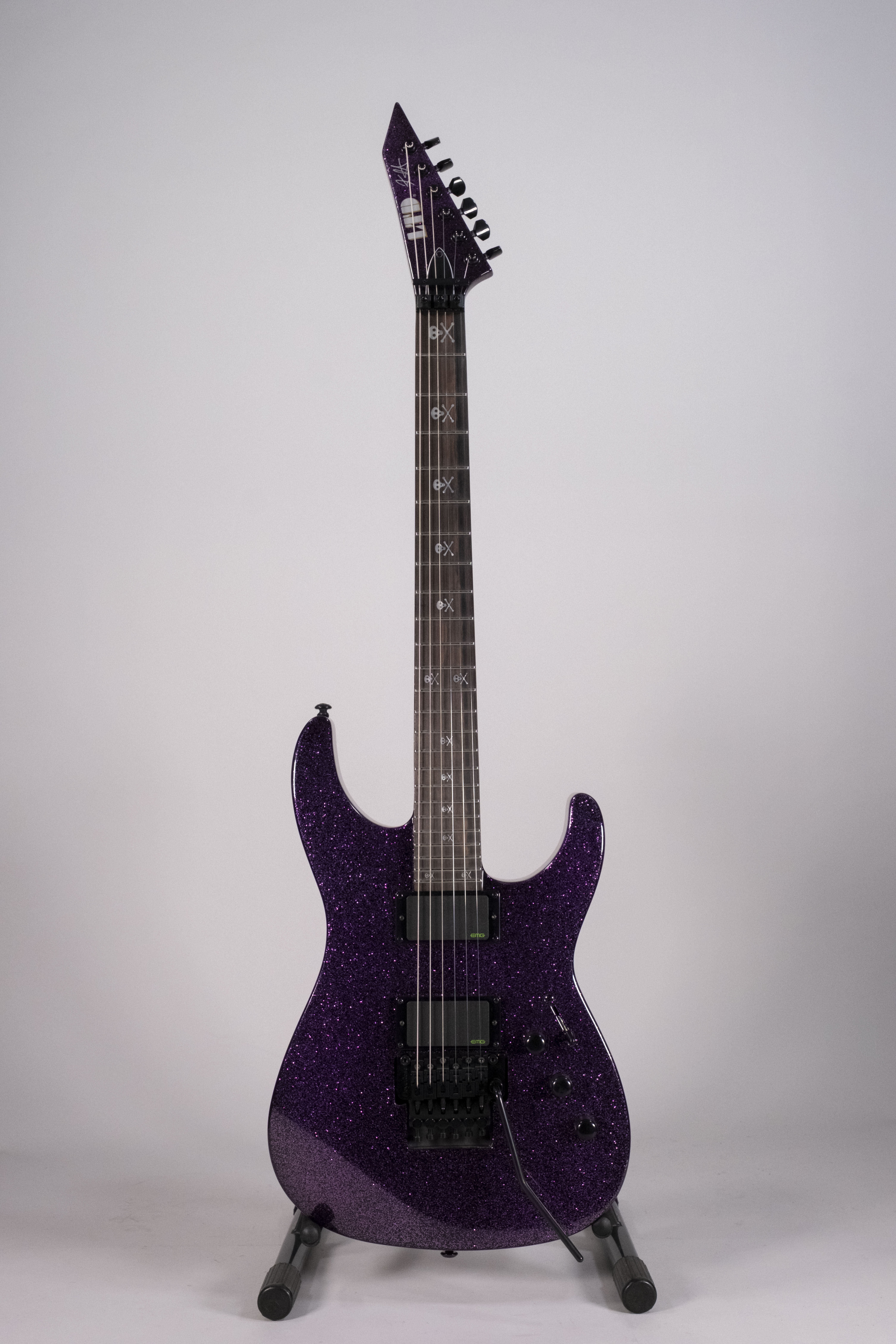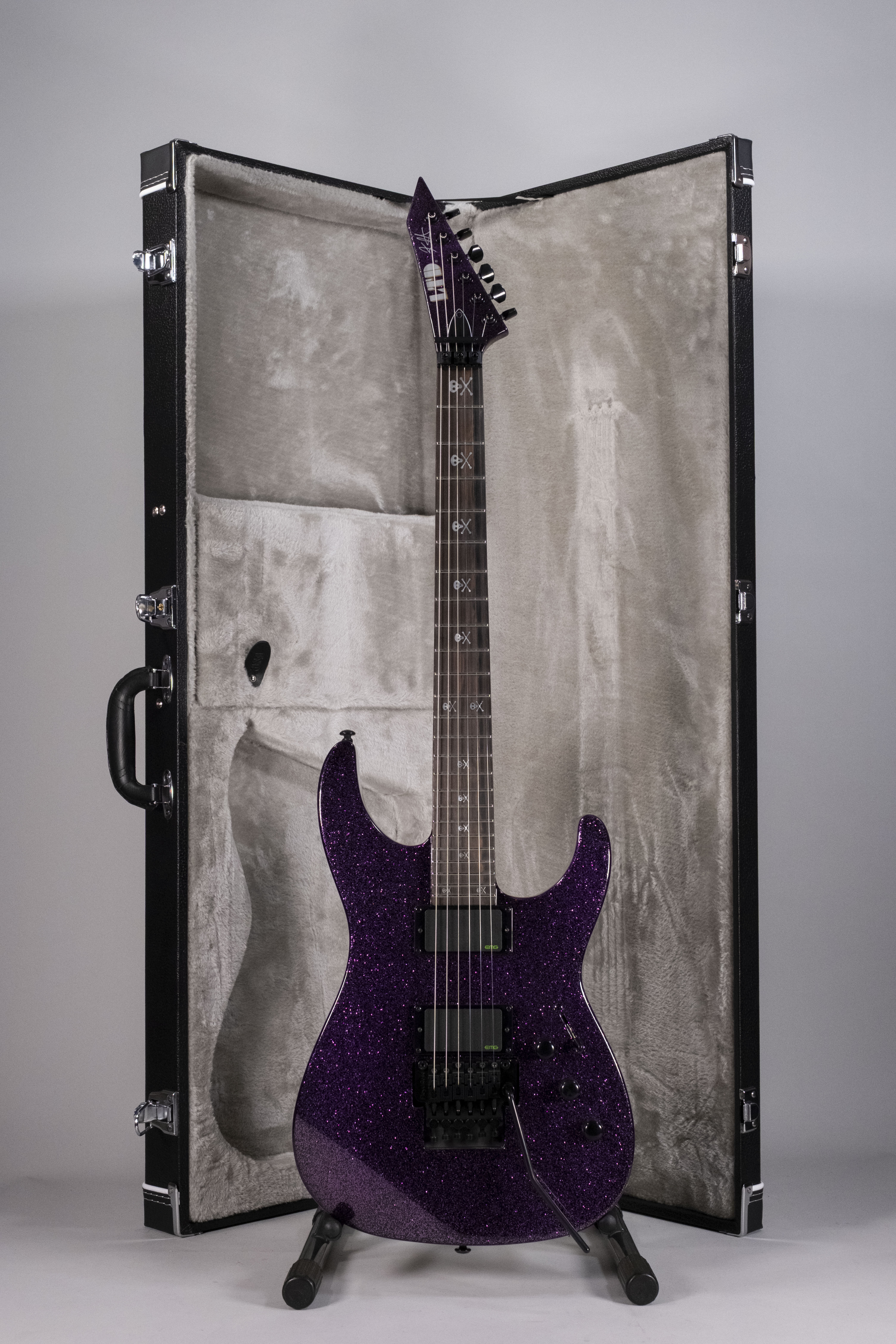 Costruzione neck-thru -Scala 25.5 Corpo in Ontano Manicoin Acero 3pz con profilo Extra Thin U Tastiera in Ebano Macassar con 24 tasti extra jumbo Radius 14 Capotasto da 42 mm Hardware nero - Tremolo Floyd Rose 1000 Meccaniche LTD - Pickup EMG KH Bone Breaker Corde D'Addario XL120 (.009/.011/.016/.024/.032/.042) - Astuccio Form Fit MH incluso