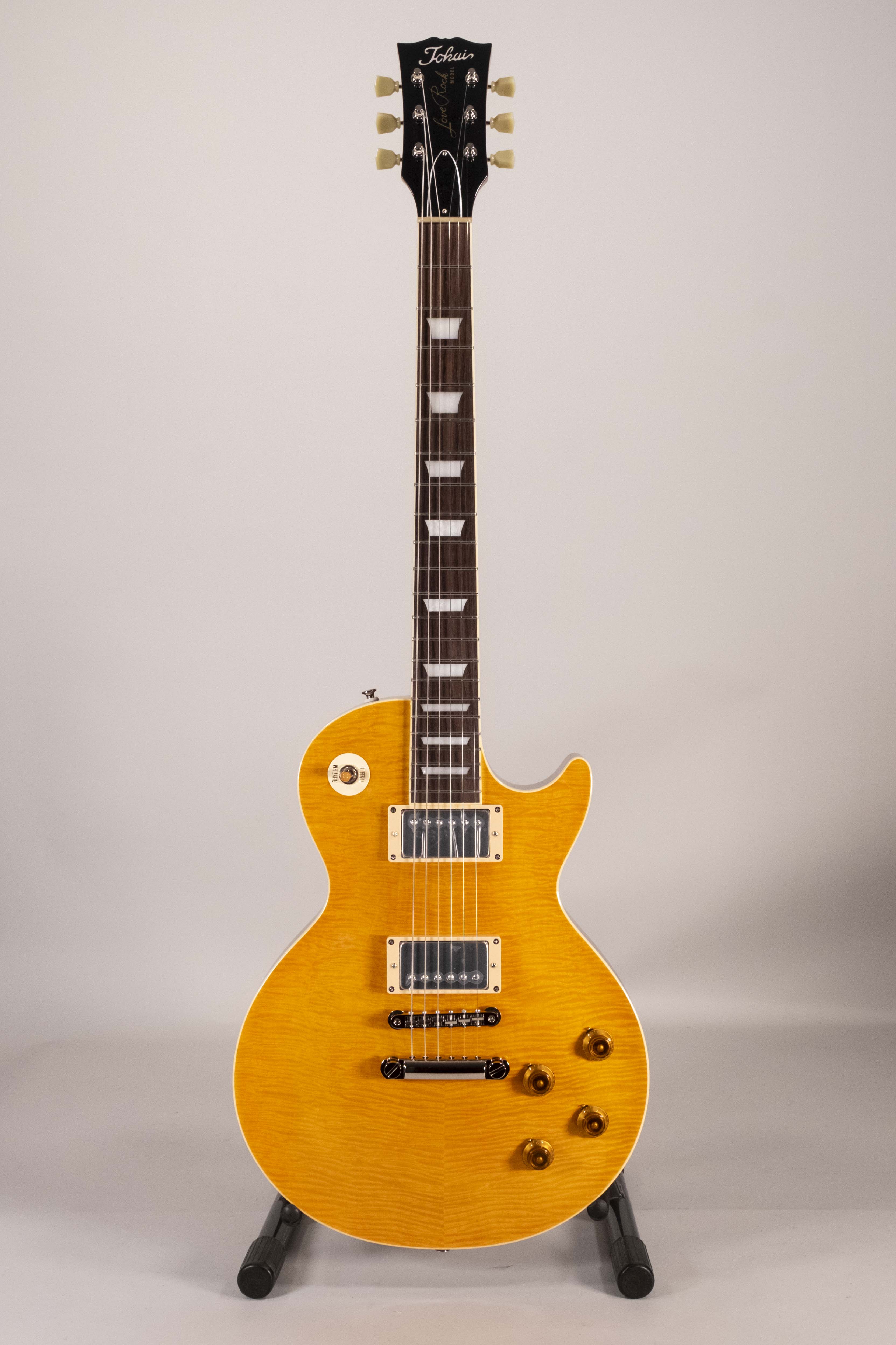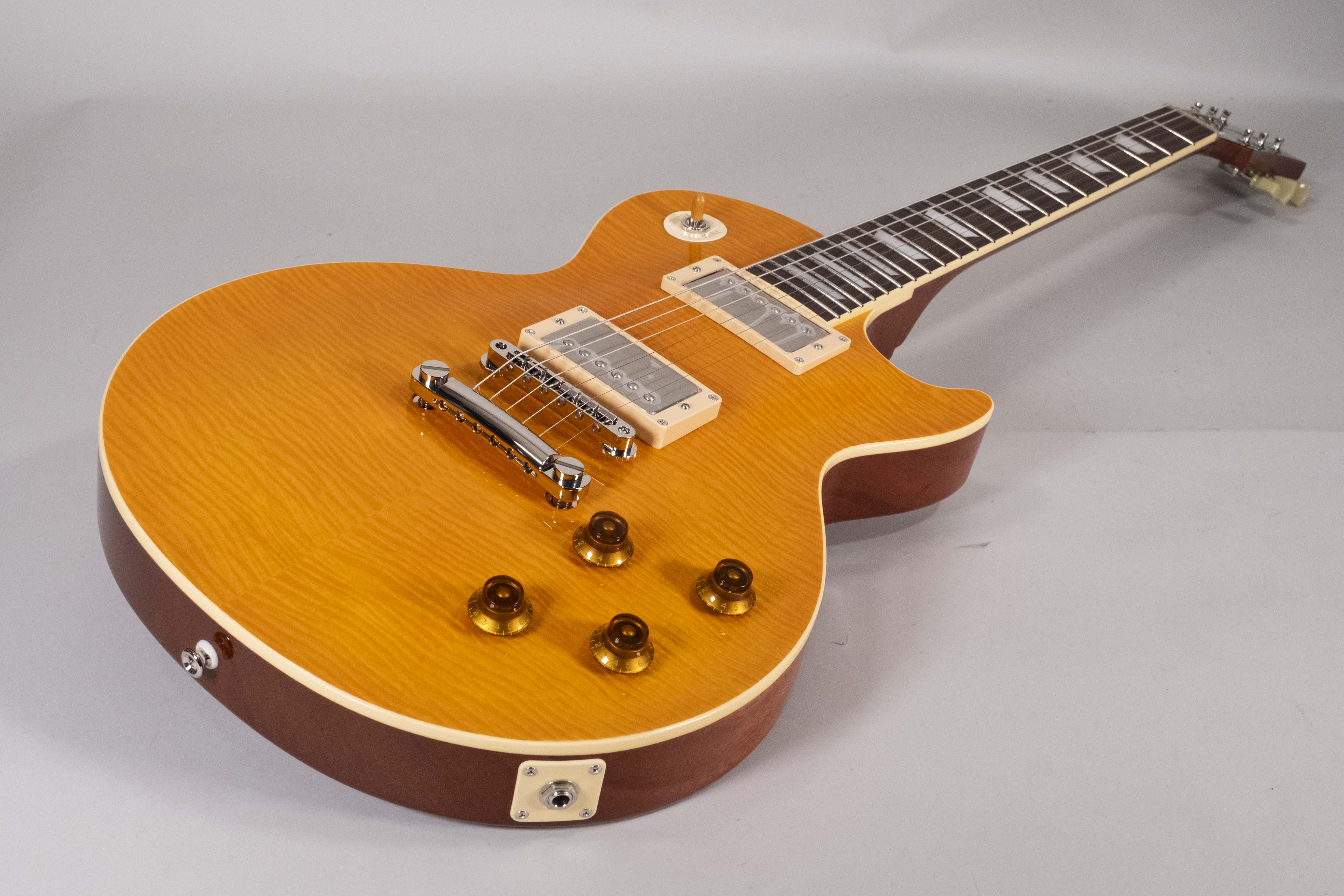 Made in Japan - Struttura: set-neck - Corpo: mogano (due pezzi) - Top: acero fiammato (due pezzi) arched - Manico: mogano (un pezzo) U shape asimmetrico - Scala: 625,0mm - Tastiera: palissandro - Radius R300 - 22 tasti Sanko SBB-214 (Medium Jumbo) - Capotasto: 43mm osso - Intarsi: trapezoid block - Battipenna: crema - Pickups: 2x Humbucker Gotoh PAF Vintage MK2 - Controlli: 2x Tono 500KA + 2x Volume 500KB + Selettore DM-20 a 3 posizioni - Condensatori: 2x Orange Drop 715 600V 223J - Ponte: Gotoh GE104B con Tailpiece Gotoh GE101Z - Meccaniche: Gotoh SD90-SL - Corde: GHS GBL (010-046) - Finiture hardware: cromate - Colore: lemon drop - Finitura: lucida (poliuretano) - Incluso case rigido Tokai in legno rivestito con tolex nero.